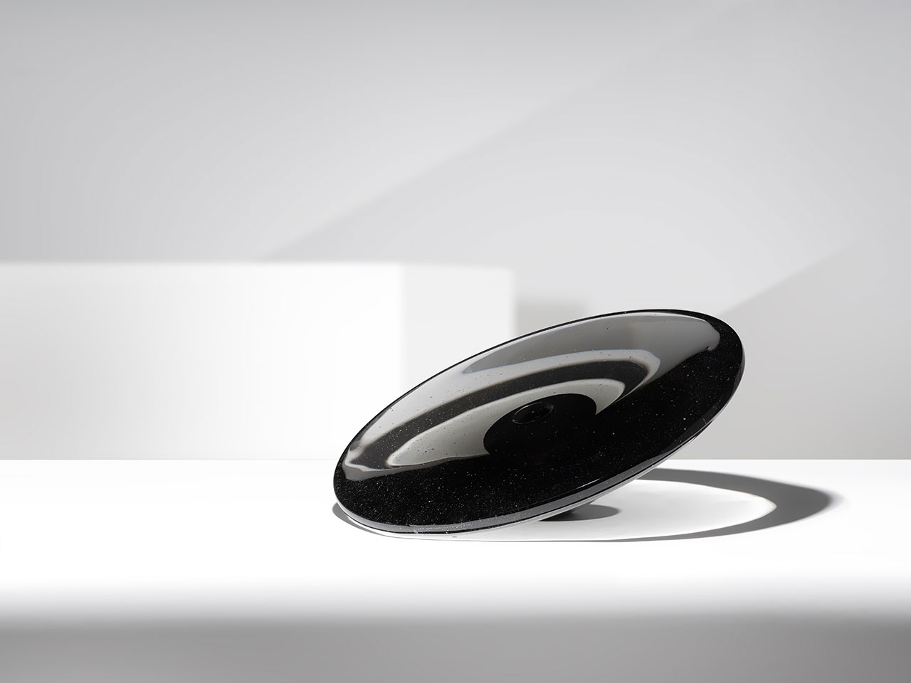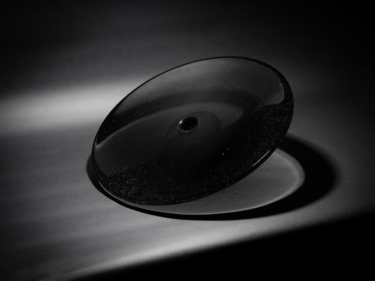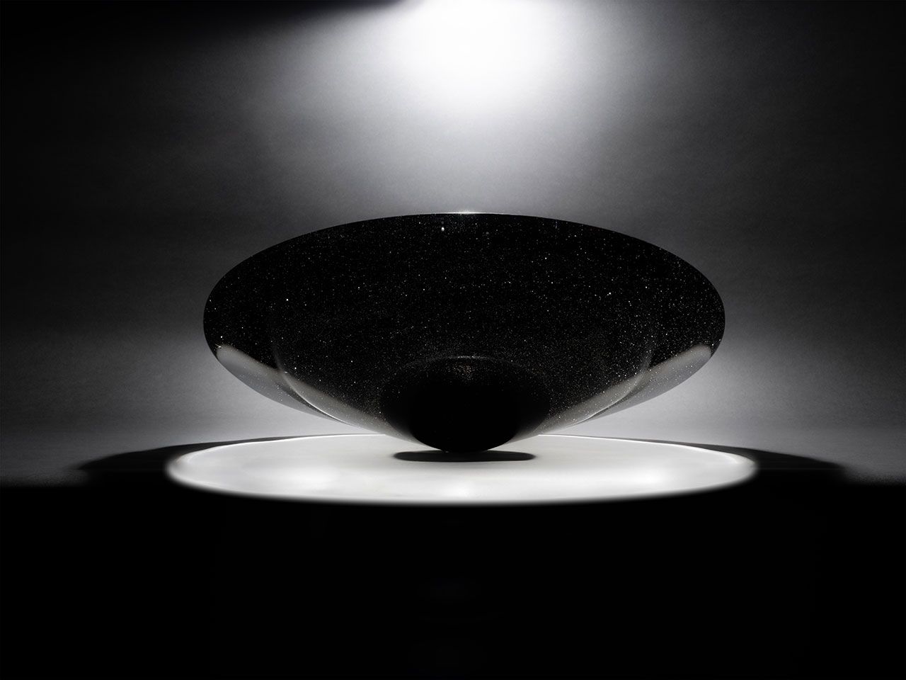 Black holes are all-consuming and inescapable for any type of matter or energy – this piece is no different. The otherworldly vase is essentially a smoky, conical form that rests on one side, bending light as onlookers move around it. The flat surface atop is jet black in the center, like an iris peering into the never-ending abyss.