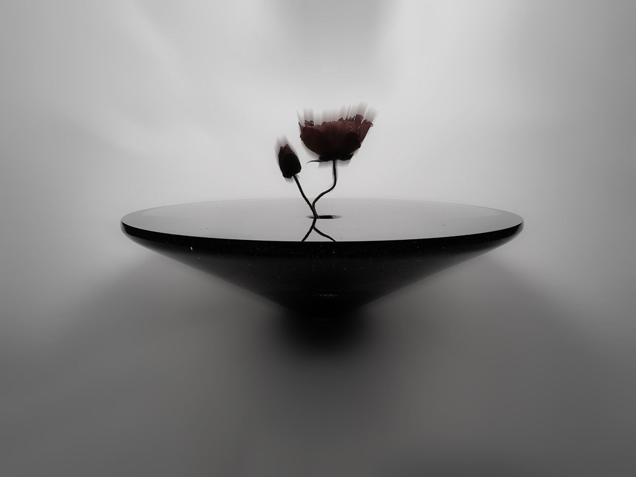 A rose, poetic and singular within the expanse, not only survives but thrives within the quietness of its existence. Showcased on a firm but translucent stage, the abstraction of an infinite universe is brought in stark relief by the living: a flash of red among the black, like the beating heart of the cosmos.