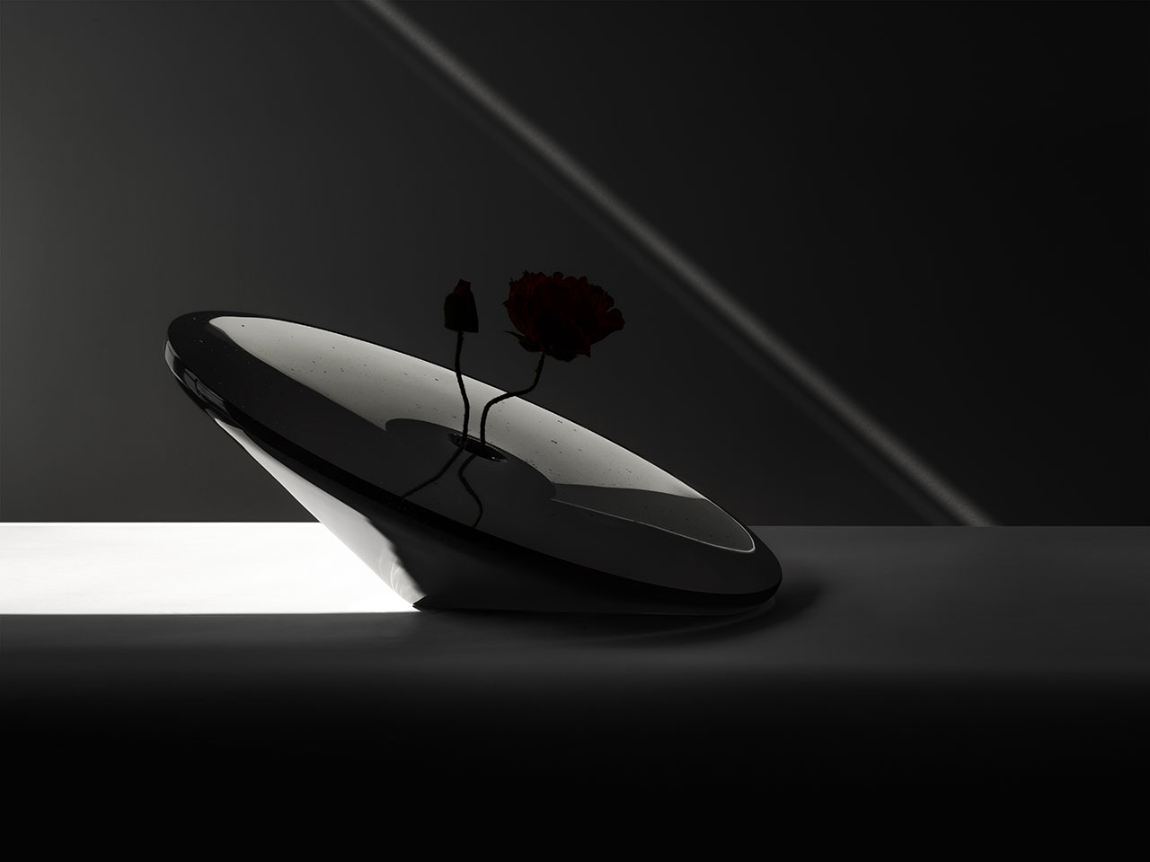 “Together we are pushing the boundaries of what is possible to craft: Geometrical, pure and solid, it challenges the notion of what a vase should be,” share the Claesson Koivisto Rune architects behind its design. “Large and heavy – it rests firmly, yet appears floating. Dark, black, but still with some transparency to make its inner reservoir visible. The flowers are not only kept watered and held up, but are also enhanced by their reflection in the flat surround.”