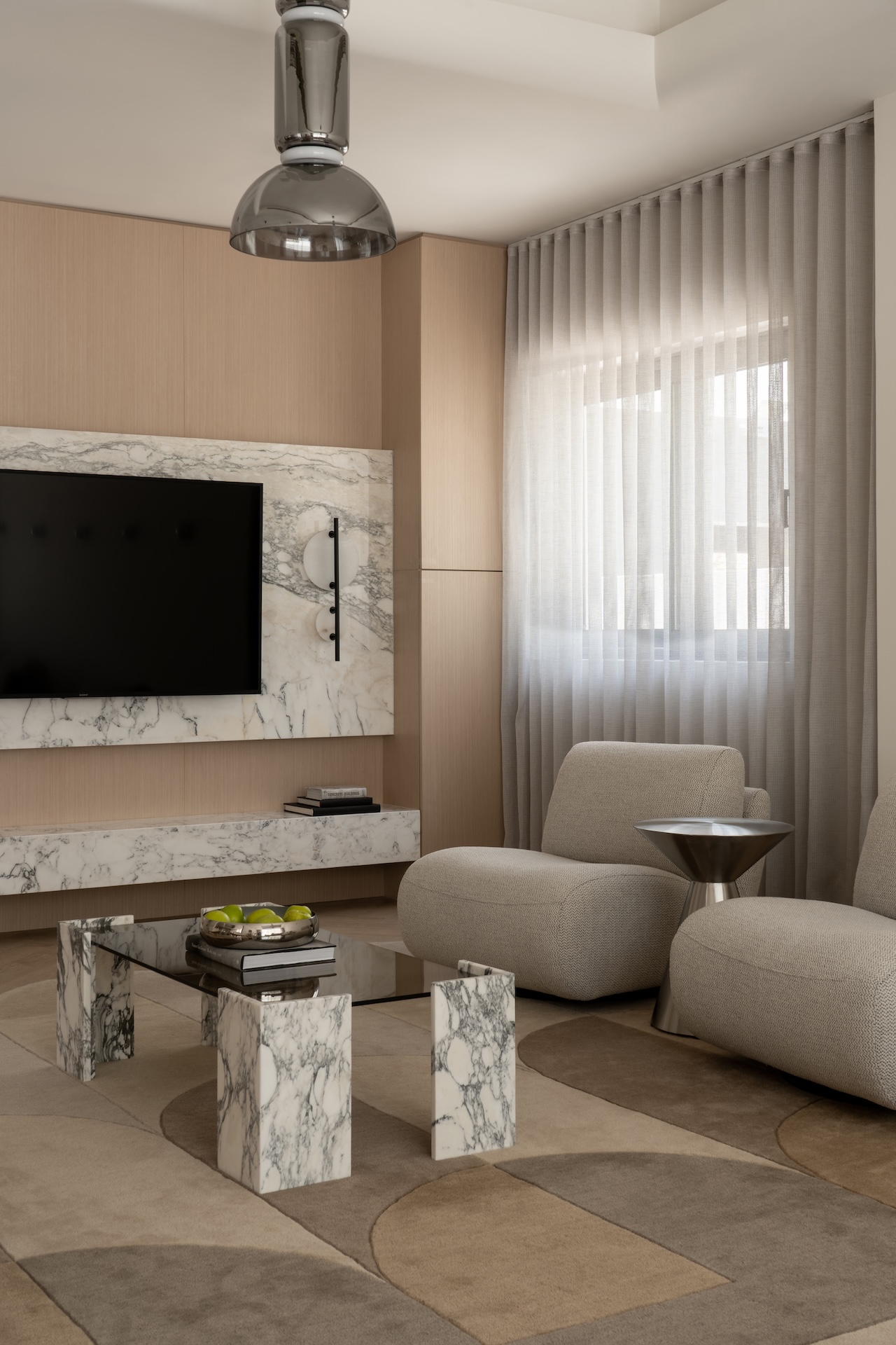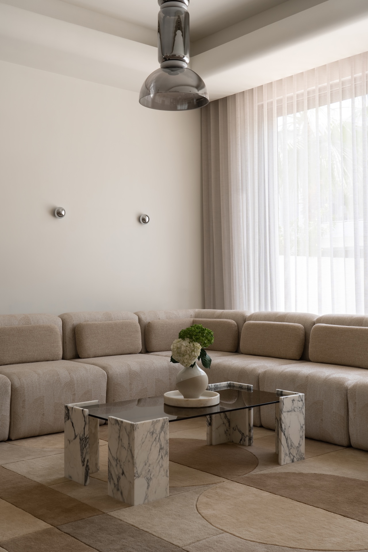 Most impressive is the commission of an eight-meter bespoke rug, handwoven in India to specification in a region where rugs often function as decorative afterthoughts, this piece became an anchoring element – its beige, brown, and soft yellow palette warming the living room without competing for attention. The choice to work with Indian artisans for a Dubai interior also quietly challenged the automatic association between luxury residential work and craft traditions.
