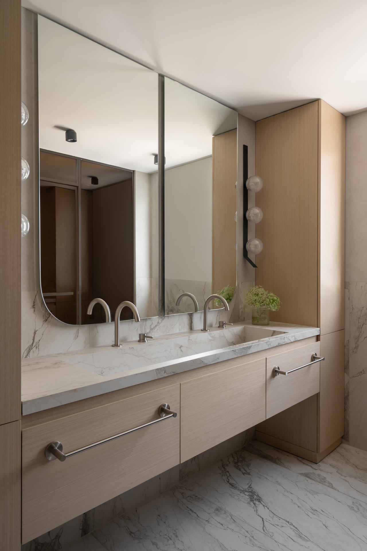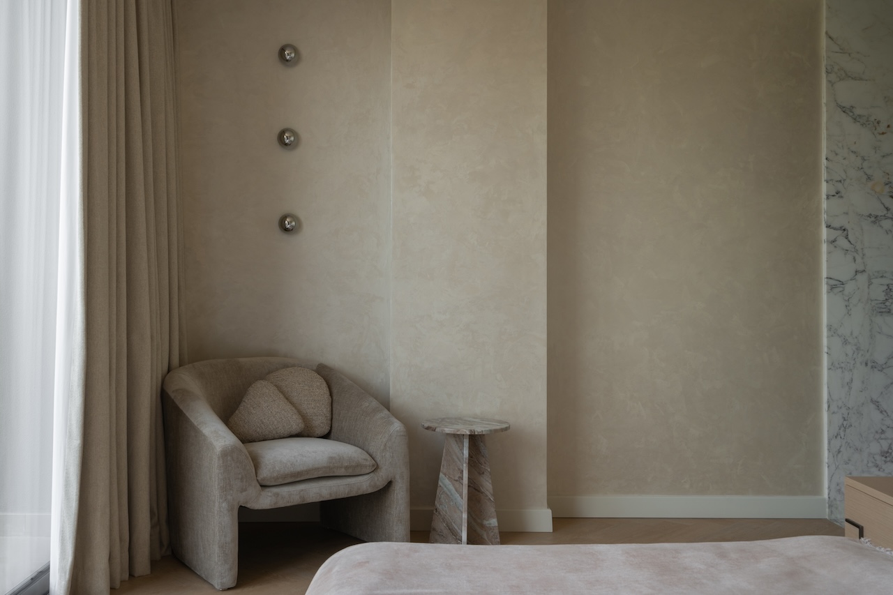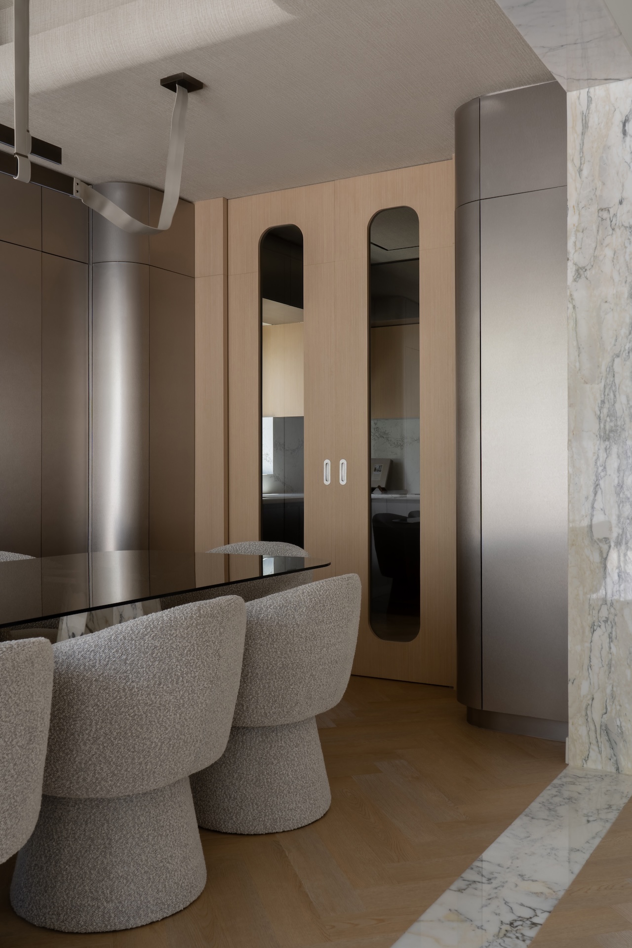 Tokai’s material palette became a deliberate counterpoint to Dubai’s prevailing taste for high-gloss opulence. Oak herringbone floors established a grounded rhythm throughout the 2,700 square foot interior, while Calacatta Vagli marble appeared not as expansive statement surfaces but as architectural framing in joinery details, surface accents, and bespoke furniture elements. The marble’s gray veining introduced just enough movement to prevent the space from feeling static, while brushed stainless steel and silver oak joinery provide moments of quiet contrast.