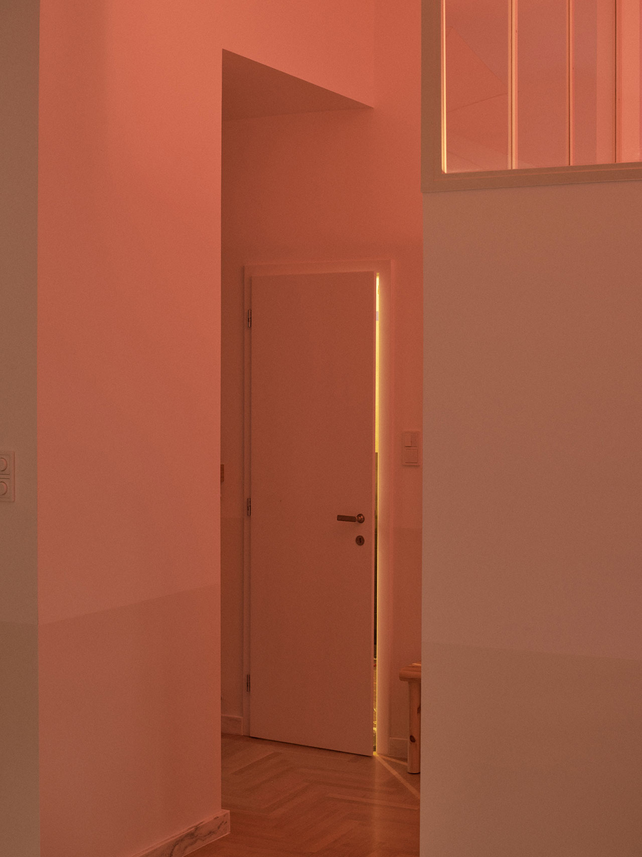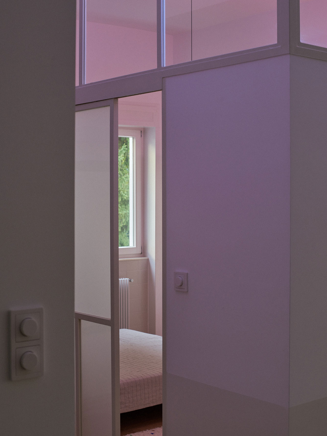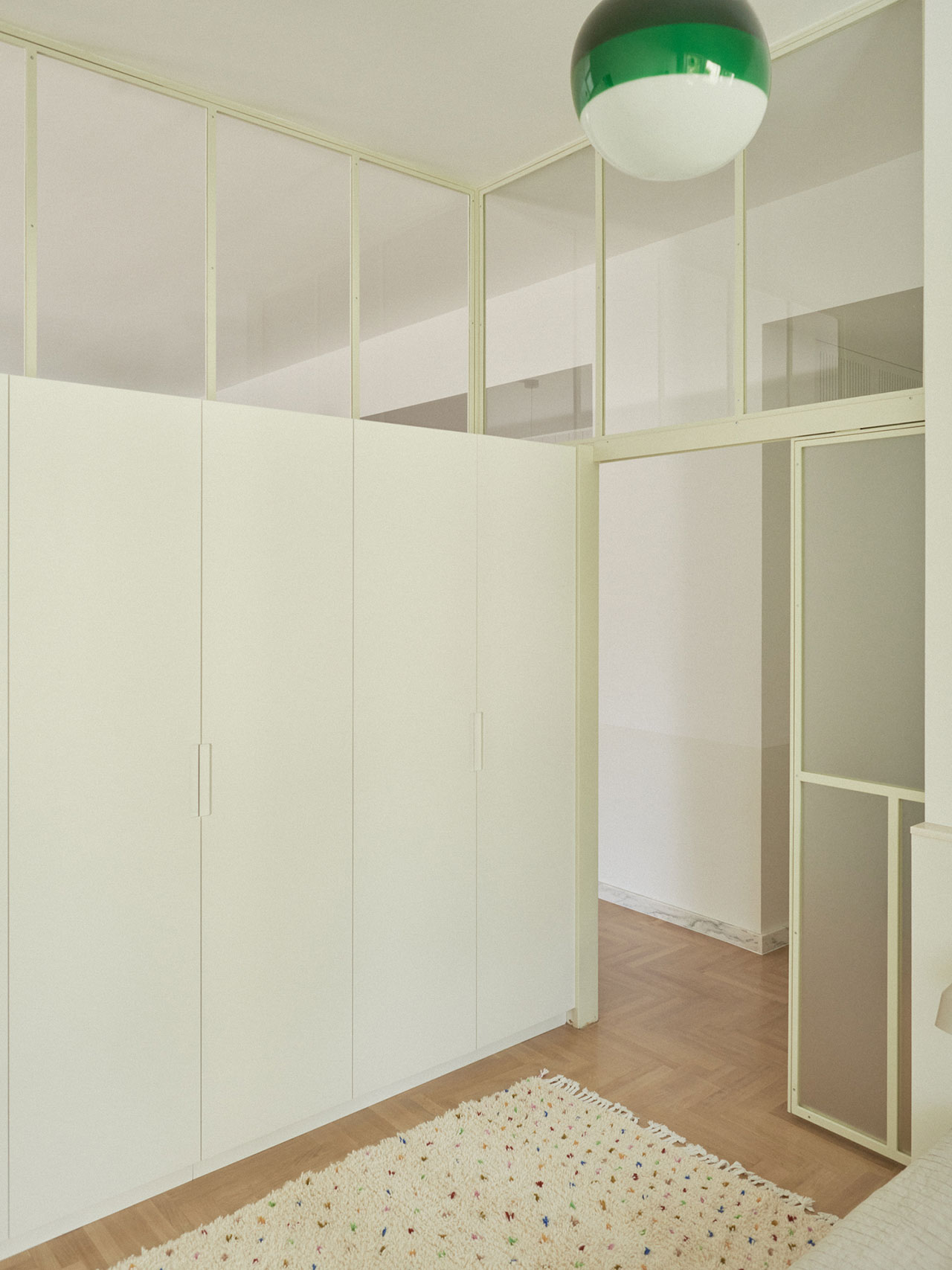 Inside, the once-fragmented layout now flows with purpose. The open-plan kitchen, dining, and living area forms the heart of the home where the family can gather. A highlight design moment occurs in the main bedroom, where an oversized original window was restored, and now filters natural light through an interior glass panel into the kitchen. The glass is framed within a custom-built wardrobe that stretches wall-to-wall. When the sun sets, it glows softly from within, transforming into an atmospheric light installation that shifts the apartment’s mood from bright and airy to warm and intimate.
