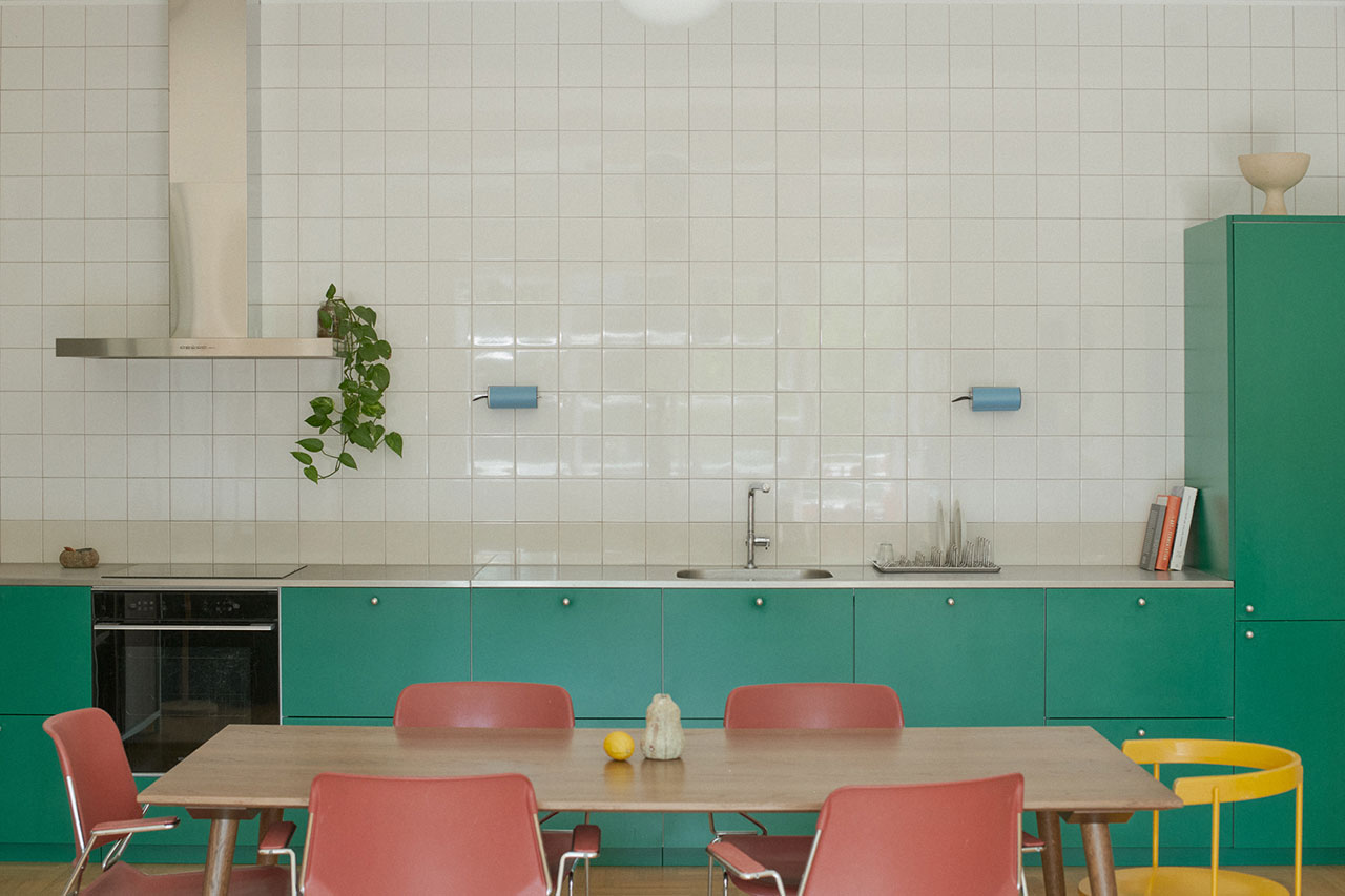 The kitchen sets the tone for the main living space with teal green lower cabinets and crisp white square tiles on the wall behind that rise to the ceiling. Muted reddish-pink chairs surround the rectangular &Tradition dining table with the addition of one sunny yellow chair at the head. A set of four mirror-backed yellow shelves displays a vibrant array of vintage Hungarian glass and porcelain pieces for extra pops of color. The result makes for a cheery color palette against the white walls.