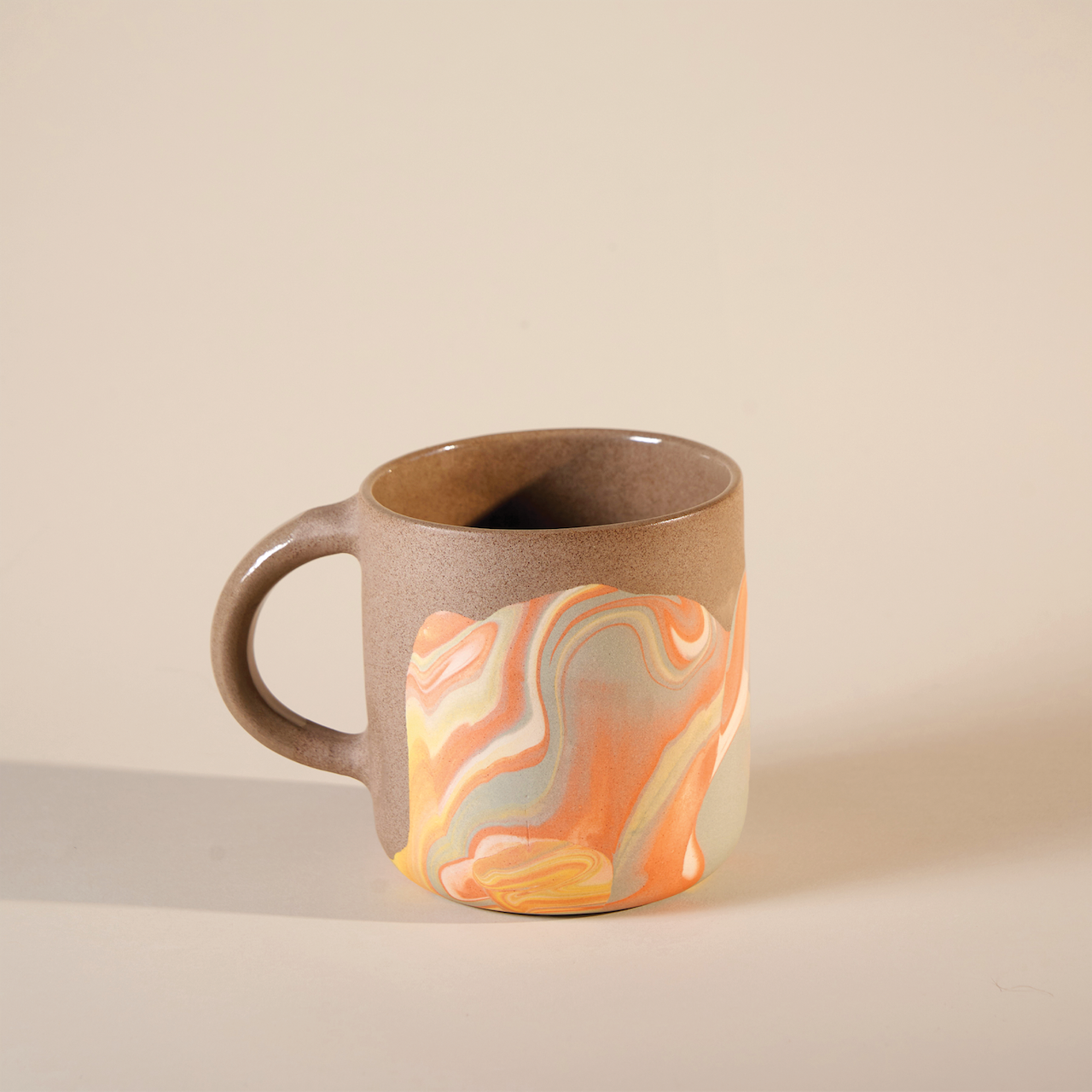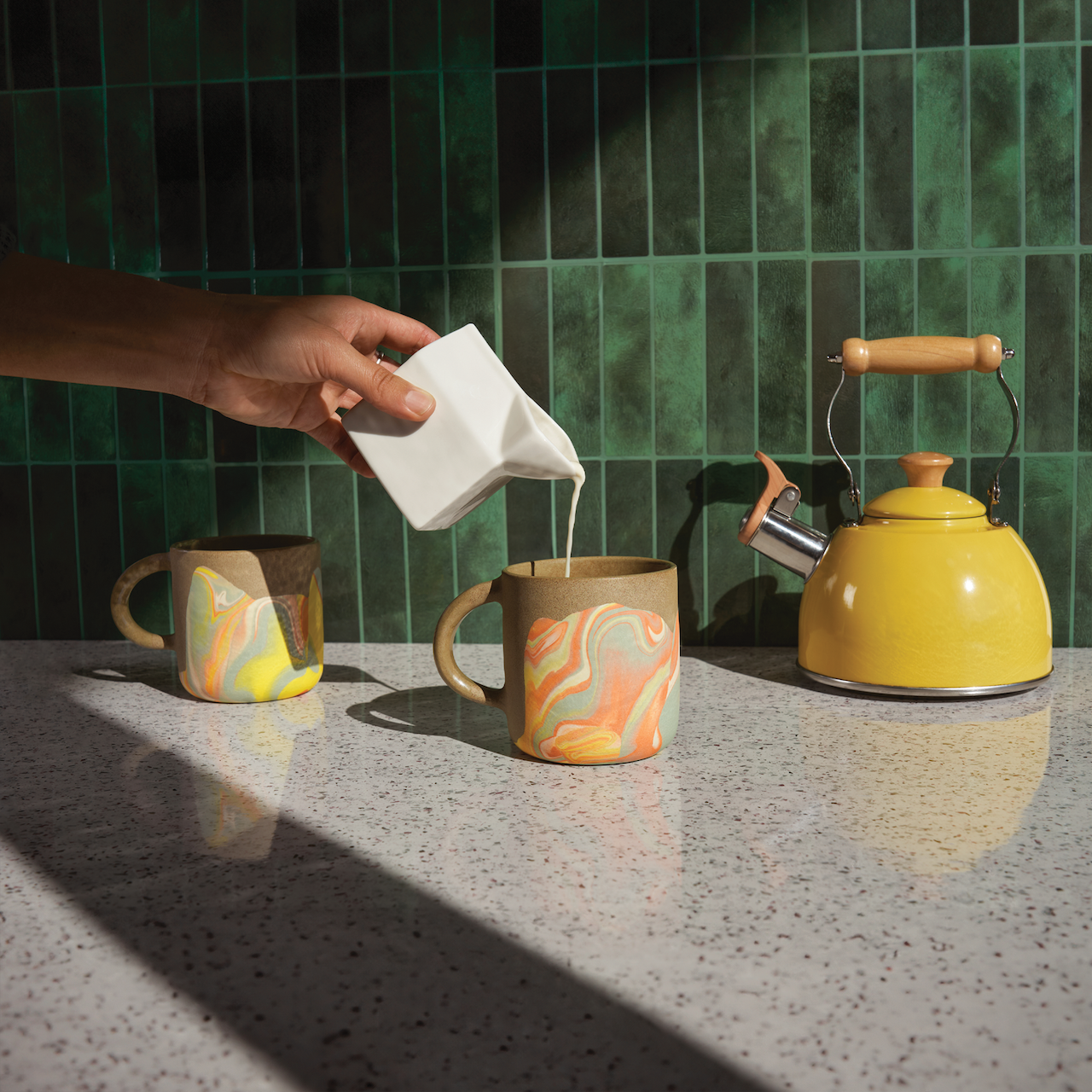 The designs for the collection drew inspiration directly from Kismet’s packaging, featuring organic shapes and playful colors – elements Levi knows well (“Swirls, chunky shapes, etc; it’s in my wheelhouse!”). True to her signature style, Levi’s process is hands-on and intuitive. “I don’t tend to sketch things out,” she explained. “I have to try it and see the finished piece before I know if it’s working.” This experimental approach resulted in beautifully unique pieces with a mix of color-blocked and twirled patterns. To accurately capture the various details of each mug, Levi sent multiple photos of the same mug to the Kismet team for feedback. When two team members happened to pick opposite sides of the same mug as their favorite, it was truly a kismet moment.