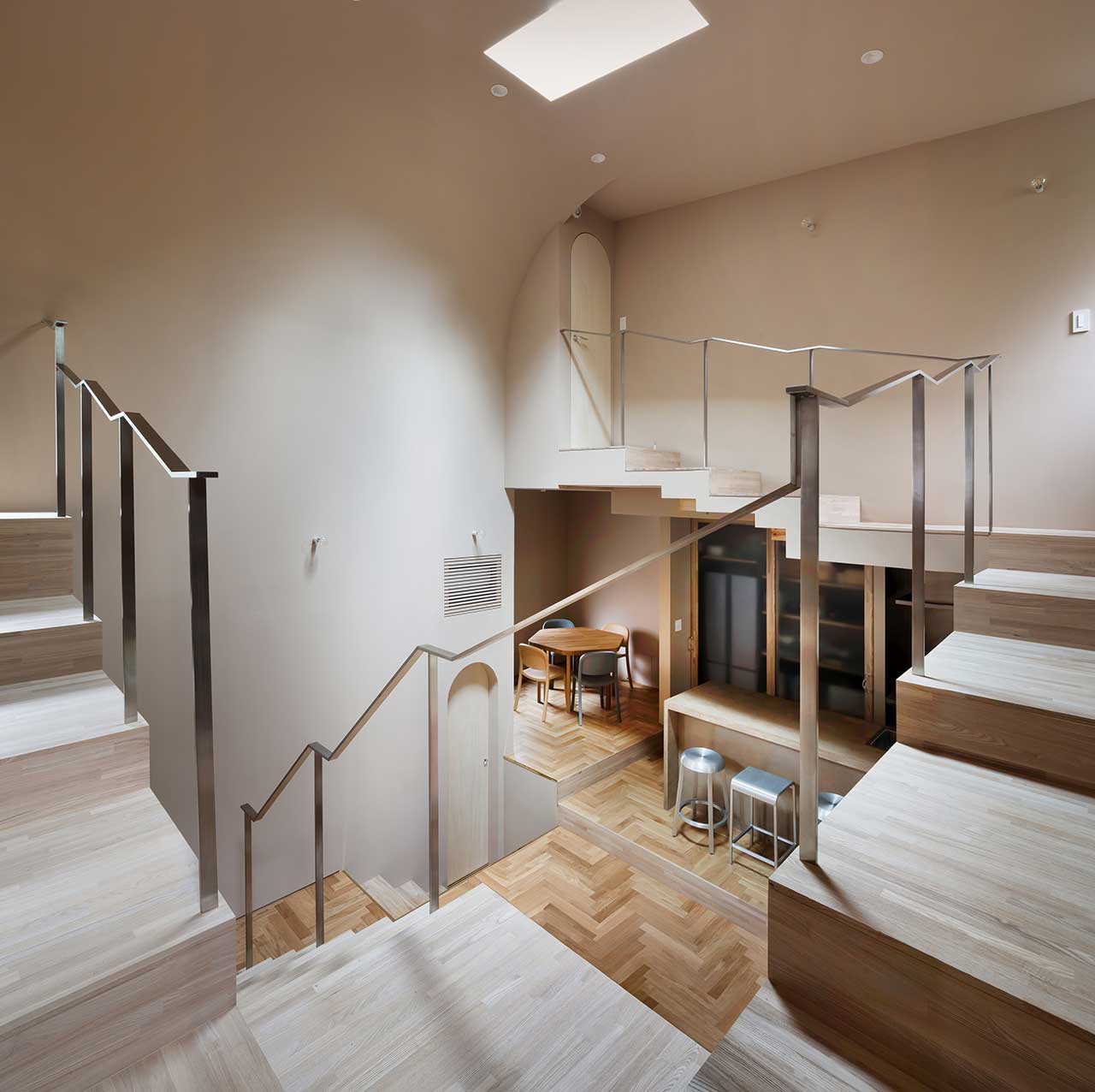 With these feline requirements in mind, the architects came up with an ingenious idea: to design the house as a giant cat tree. The entire house is conceived as a large staircase, with an atrium at its center that’s lit by a skylight. Natural light filters through, creating a play of shadows on each step throughout the day. These steps, inspired by the body measurements of the cats, result in a total of 23 different floor levels. The house is divided into temperature layers, each providing a unique environment for the cats to explore.