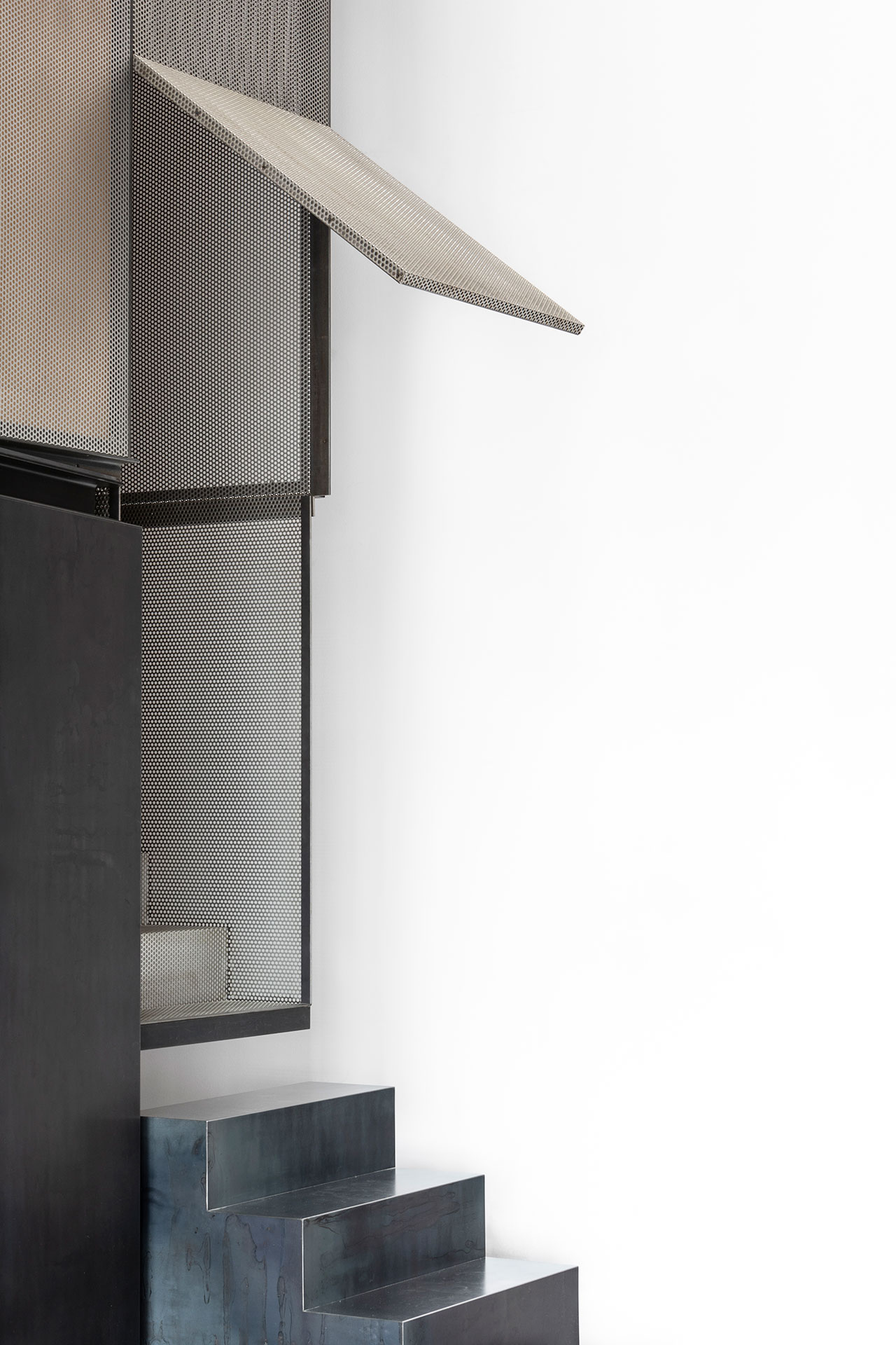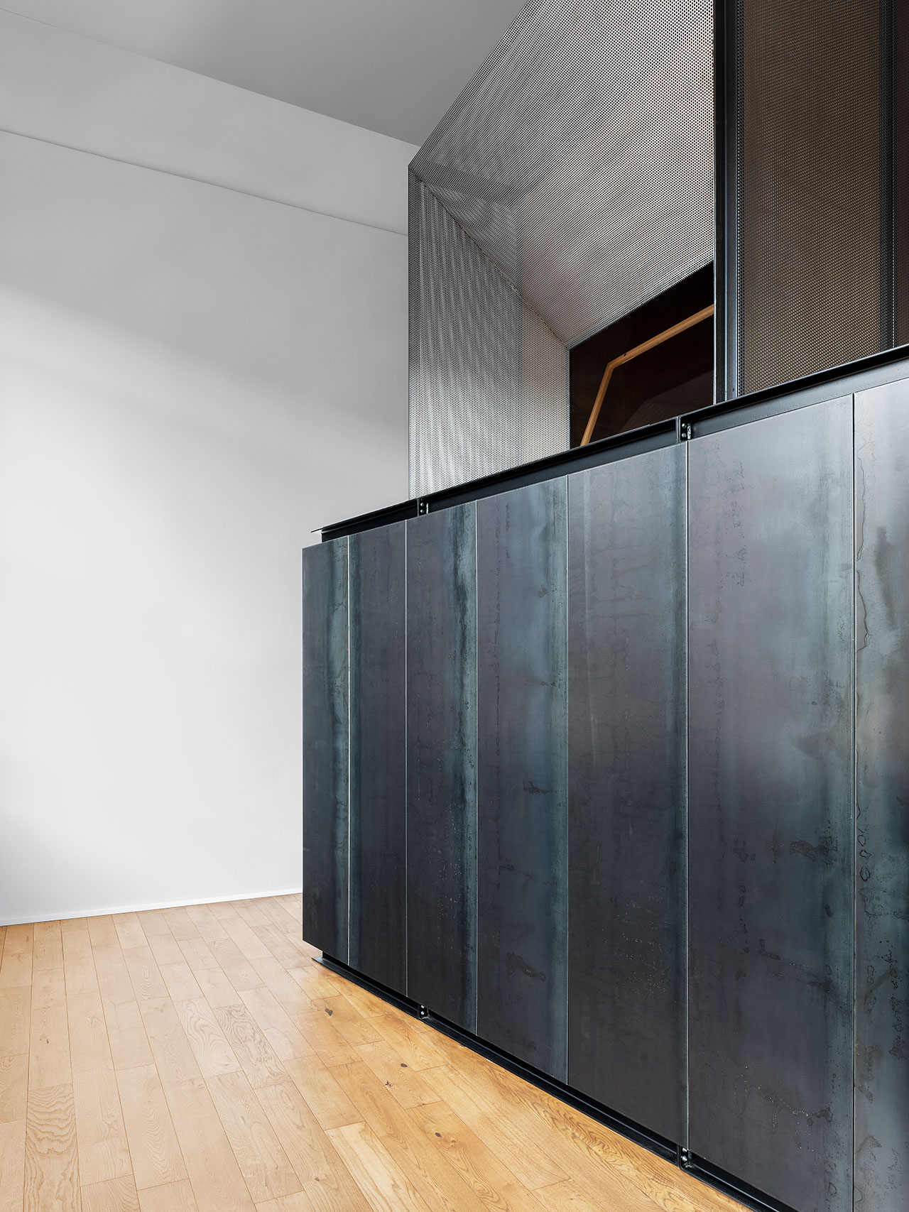 Stacked metallic volumes offer additional enclosed spaces, including a burnished carbon steel sheet metal room dedicated to a home theater on the bottom, and a cozy guest room paneled in micro-perforated sheet metal above.