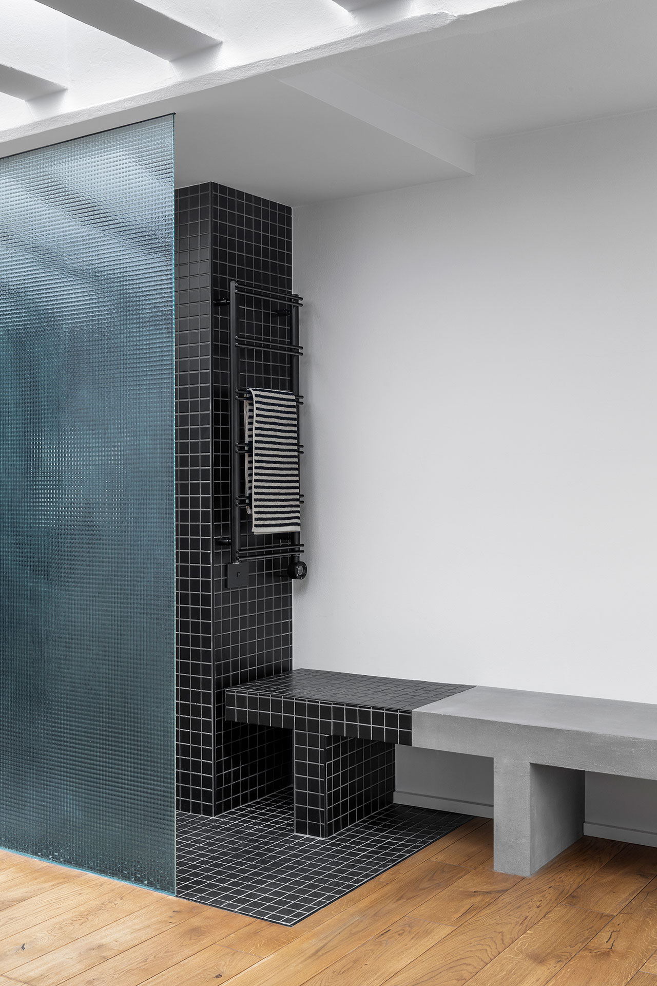 The third floor is home to the primary bedroom, which is built off of a central walk-in closet. The open space includes a walk-in shower and floating black bathtub in the middle of the bedroom. The space leans towards a contemporary minimalist aesthetic complemented by iconic design pieces, such as the LC4 chaise lounge by Cassina.