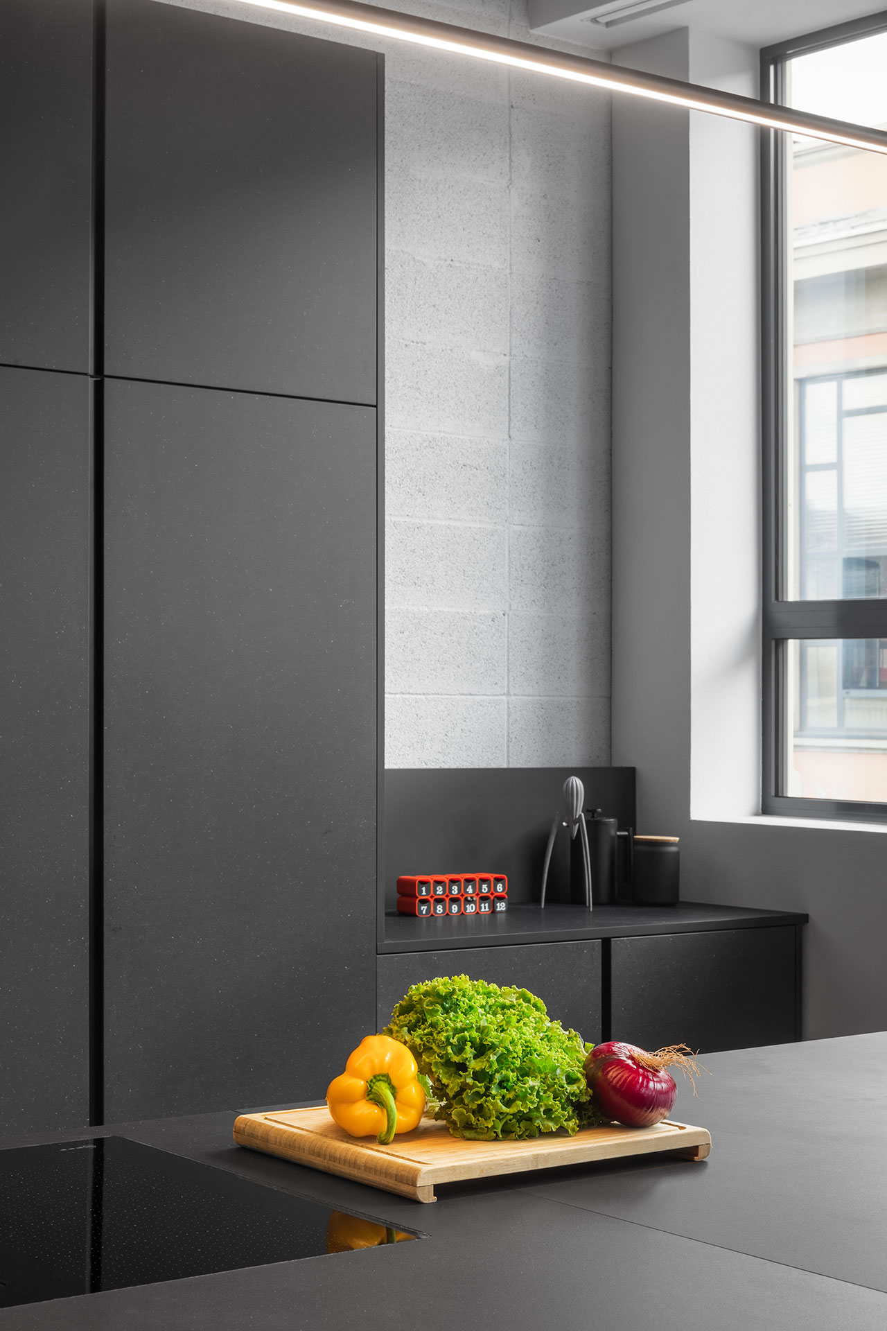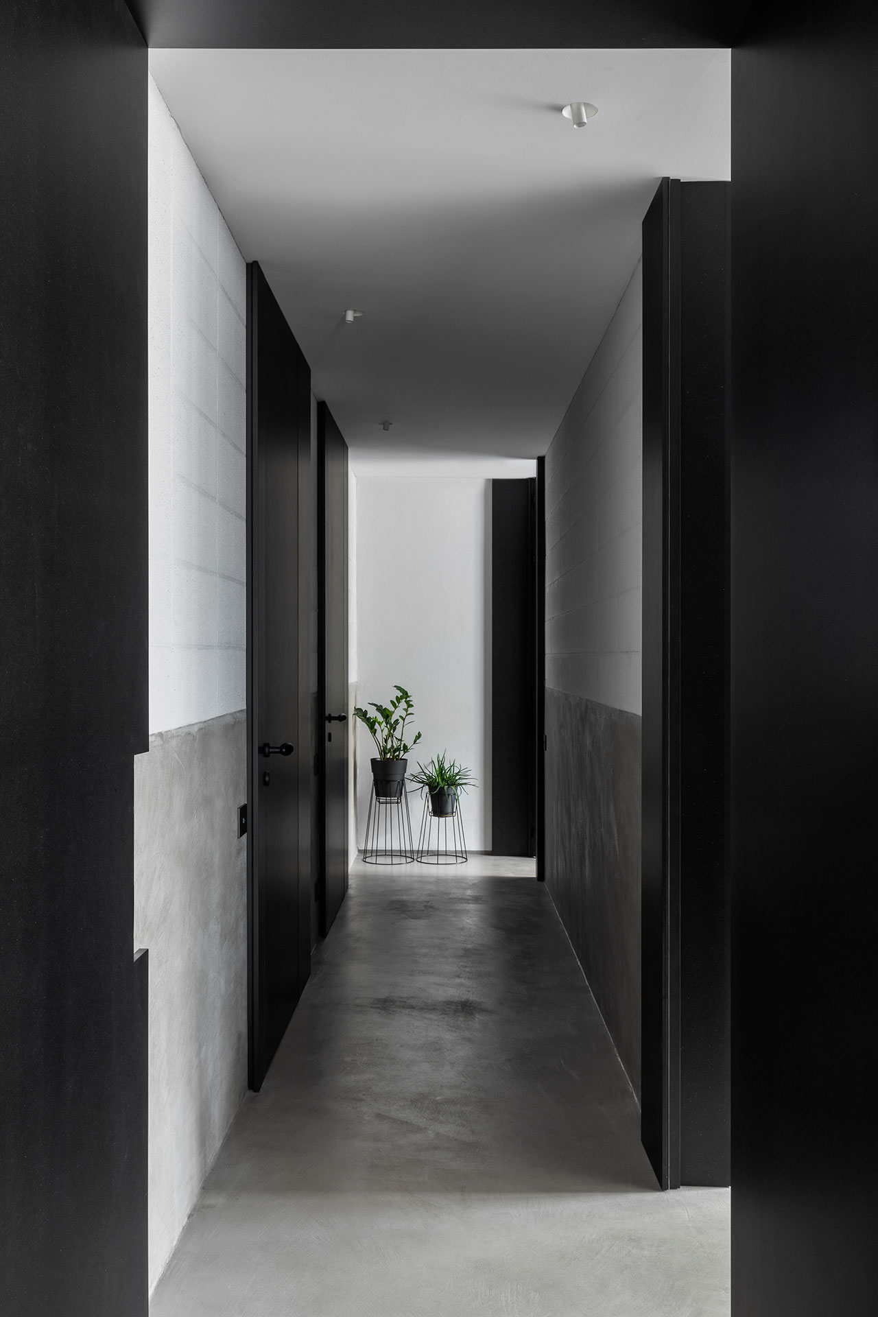 What sets this project apart is its commitment to an open floor plan that’s highlighted by voids thanks to the addition of geometric volumes incorporated to define the spaces. Dark metal finishes starkly contrast with the expansive light surfaces, celebrating the interplay of light and shadow that streams through the apartment.