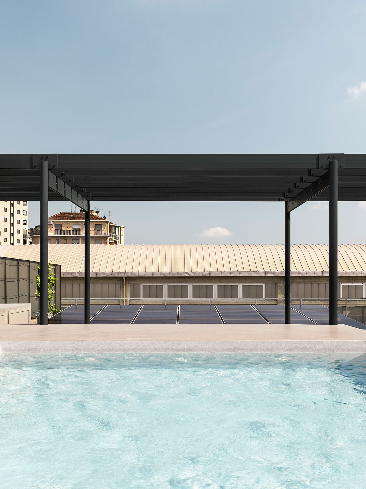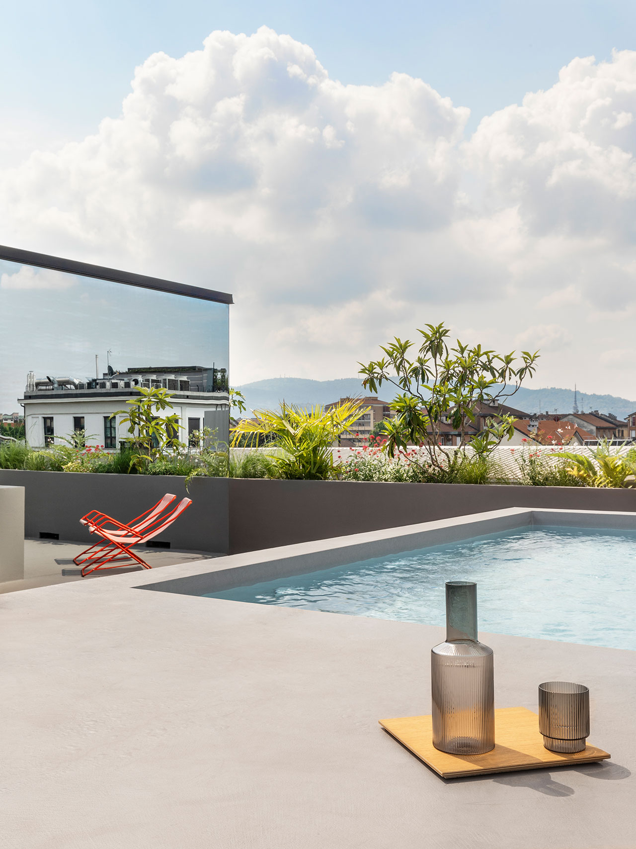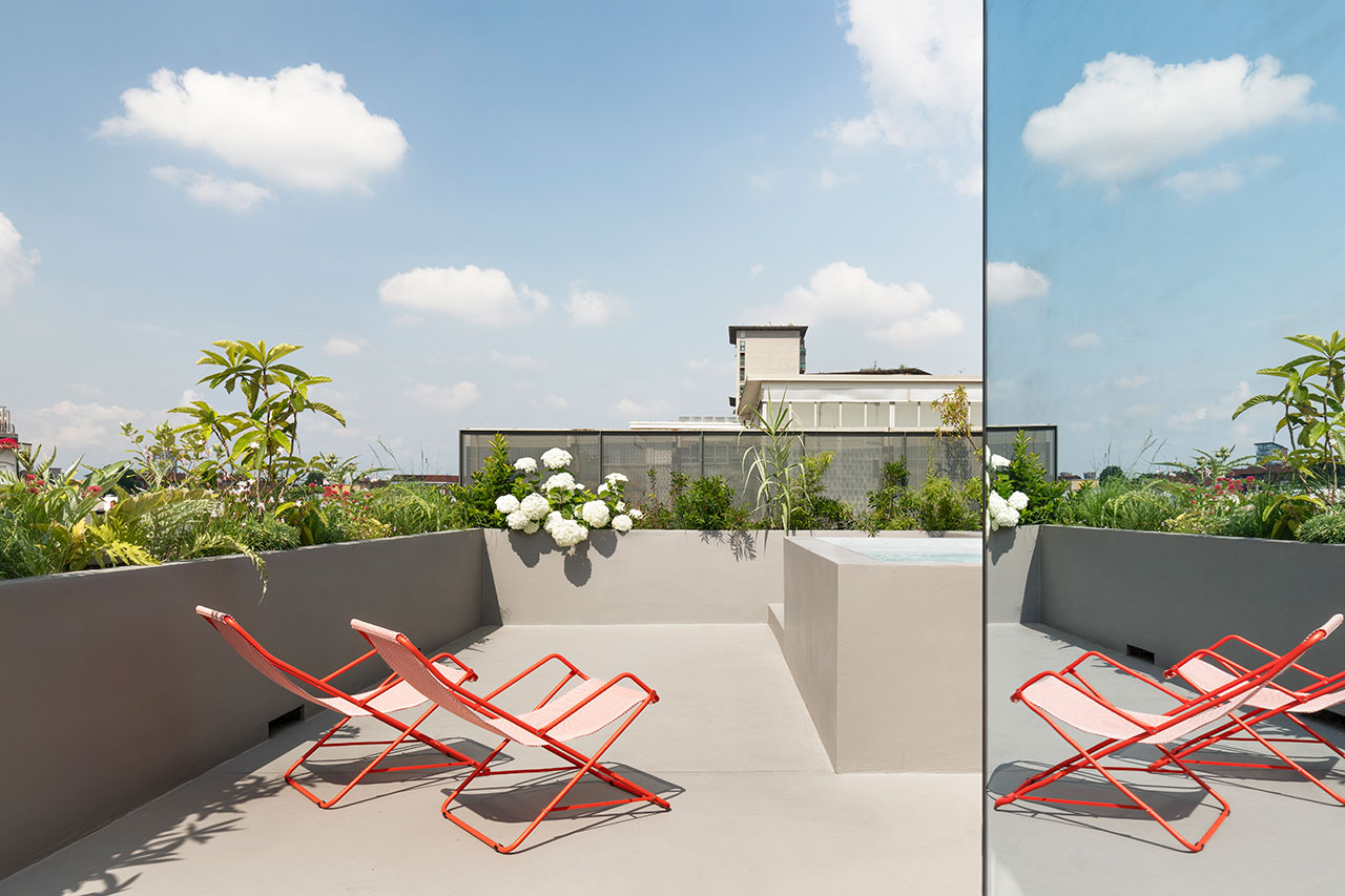 Finally, the pièce de résistance is the fourth floor, a rooftop terrace that offers panoramic views of the city. It features a pergola, outdoor kitchen, seating spaces, sauna, and a swimming pool (!!), all encircled by lush greenery and small fruit trees.