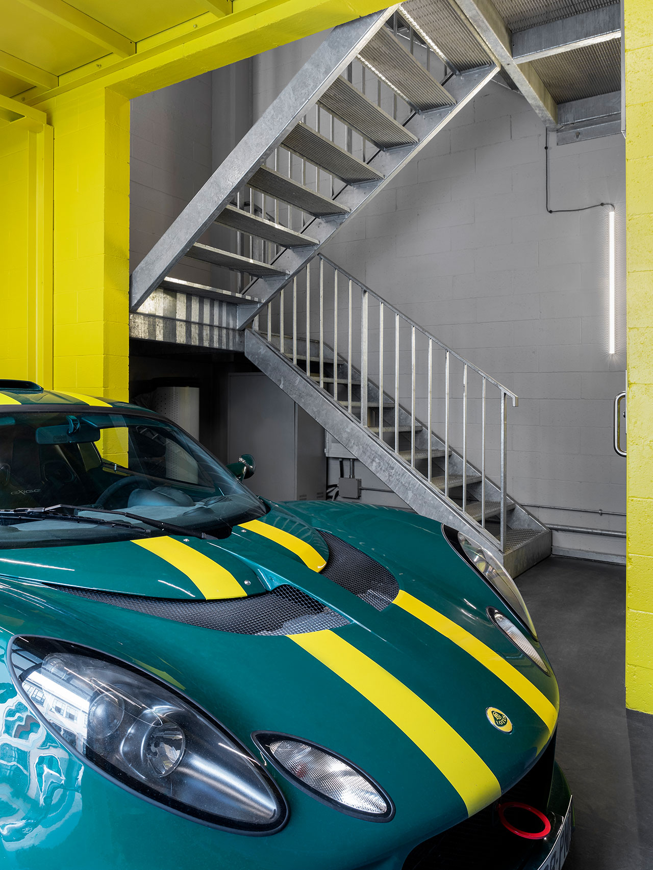 Casa MRGT’s ground floor is a garage that doubles as a gallery for the owner’s classic car collection. With vibrant yellow accents and exposed structural elements, the space is an eclectic backdrop to the cars it houses. A private freight elevator and a steel staircase connect the garage to the rest of the home, transforming from raw industrial materials into more welcoming domestic finishes.