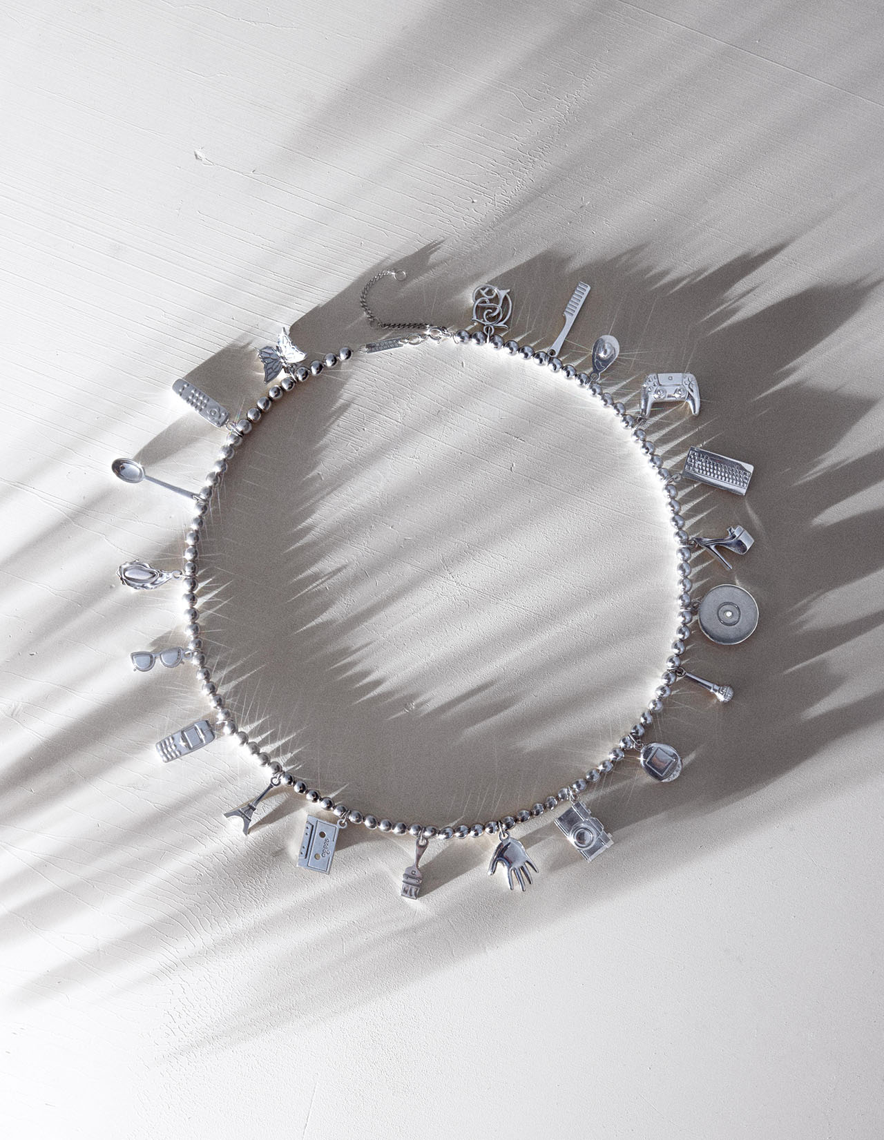 The creative synergy is focused on the ready-made tradition – or what Nuriev calls “Transformism” – turning everyday items, familiar artifacts, and the typically mundane, into striking pieces of artful jewelry with subtle irony. Small but mighty, the charms take center stage as the collection’s hero in the 16 Trinkets Bracelet. Otherwise, pendants may be hooked on a chain or earring, and placed wherever you desire.