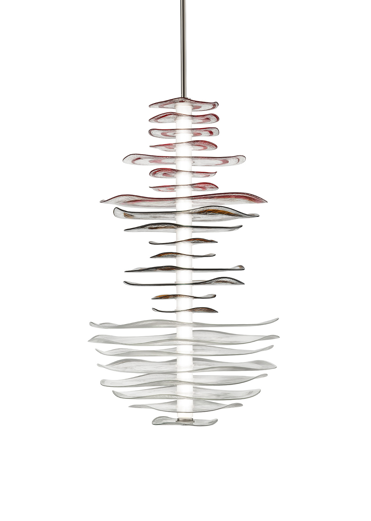 Starting from the top, red rings of color radiate out in circles from their centerpoint, growing in size as they continue down the column. A bit smaller, deep brown rings radiate next, preparing the eye for an explosion of white at the bottom – curious circles of glass making their way outward. The spiral motif embedded within each disc, left behind by the rapid spin of molten glass, subtly emphasizes the meeting point of movement and matter. Together, the edges imply a figure suggestive of an antiquated Schoolhouse pendant light and its glowing milk glass, diffusing and softening the glow as it filters through the glass.