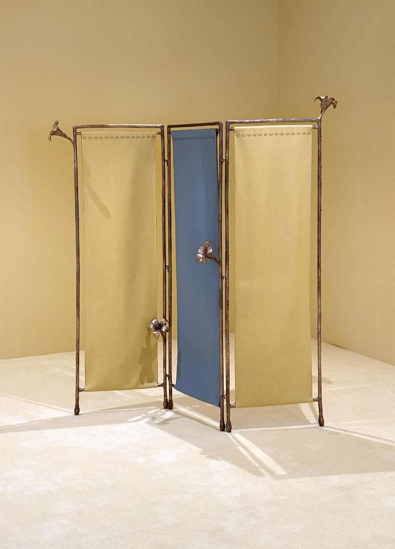 The gently articulated flourishes stemming from Argentinian artist Conie Vallese’s Fonderia Fendi chair, bench, and room divider are equally pictorial, but also fantastical. These meticulously stylized appendages emerge from the thin rosy bronze open frame structures. These armatures – crafted by age-old Milanese foundry Fonderia Battaglia – also hold-taught leather sheets carefully treated and colored within Fendi’s workshops. The “romantic” collection was developed to commemorate the Italian fashion house’s centenary, as well as the lasting value of the country’s rich artisanal heritage. Other heavy hitters – ceramics studio Officine Saffi Lab, carpet weavers cc-tapis, and the 13th century Venetian glass studio Barovier&Toso – were also involved; responsible for various subtly introduced decorative details. The room divider, in particular, embodies the visceral tension between the imperfection of the human hand forming material and the precision of carefully proportioned architectonic composition.