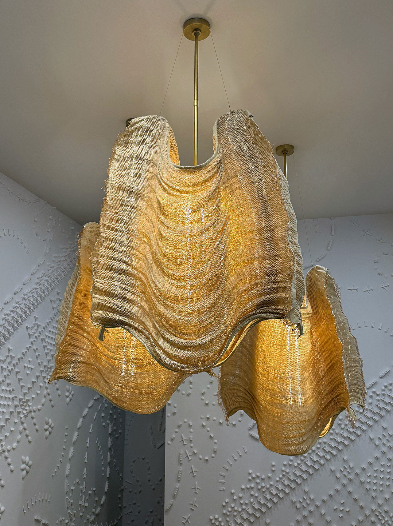 An ever-alluring and apparently malleable material, bronze also cropped up in fiber artist Carl Johnson’s latest 2025 and 22 Gauge Bronze Wire pendant lamps, presented by Savannah College of Art (SCAD) within its Haptic Enchantment and Sculptural Sorcery showcase. Exploring the tension between softness and rigidity, the flowing forms were created using bronze wire; an application rendering the otherwise solid metal into tensile and weavable strands. Blended with cotton, the material adds an iridescent, light refracting quality to what first seems like a billowing burlap sack suspended as a lampshade. The striation of each thread extends the illumination even further, evoking an ethereal, if also whimsical quality.