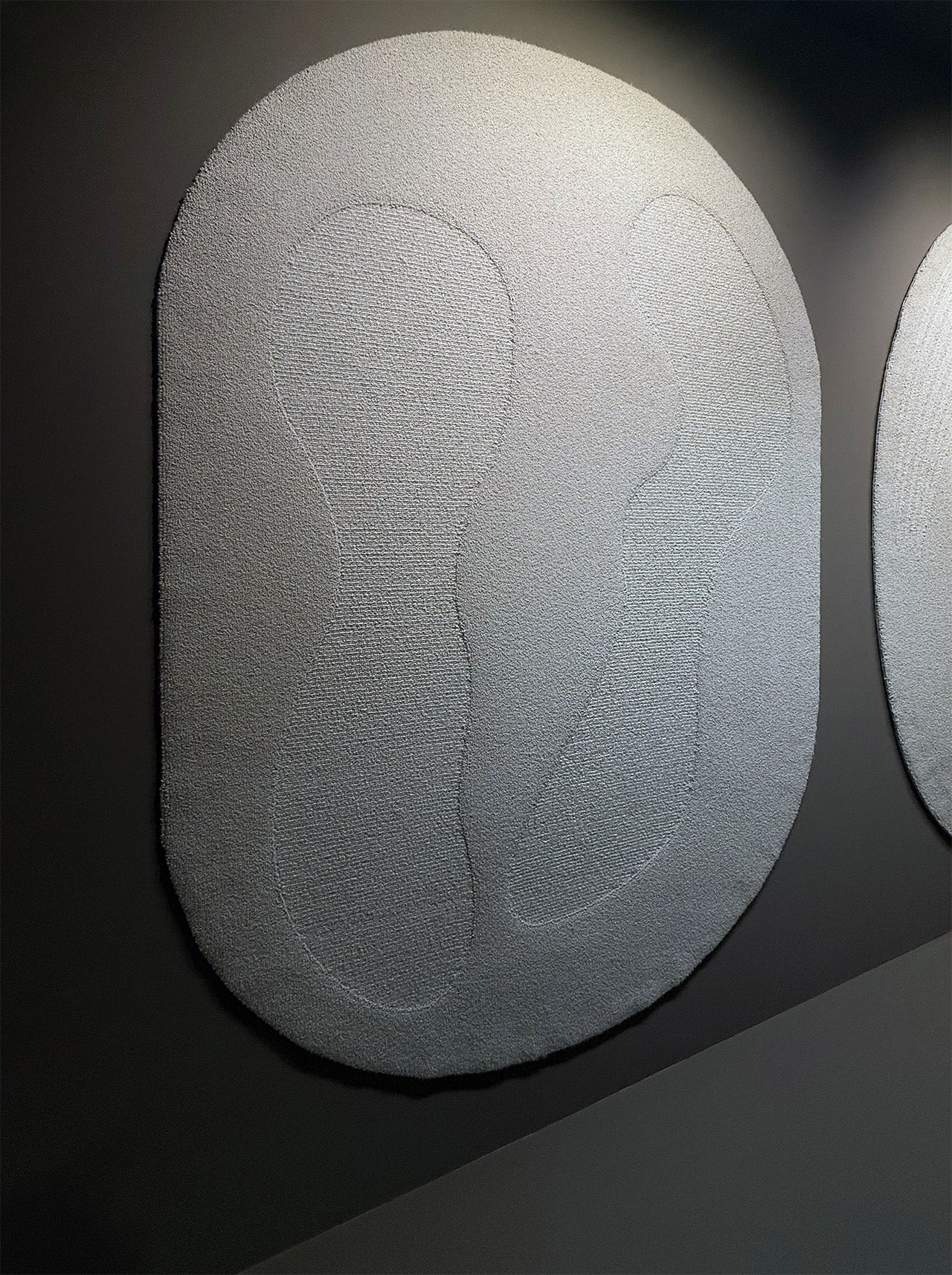 Organicism was also the driving force behind boutique Massachusetts-based rug brand Merida Studio’s “Living in Ma” display. Meant to offer fairgoers a moment of visual reprieve, the softly hued, monochromatic booth emulated the Japanese concept of finding pause between things. On view were equally contemplative artist proof rug concepts by in-house designer Sylvie Johnson. Showcasing the producer’s ability to create contrast within tone-on-tone composition is the all-white, stadium-shaped Yang design. The amoebic cut-away forms are distinguished by the variation of implemented technique.