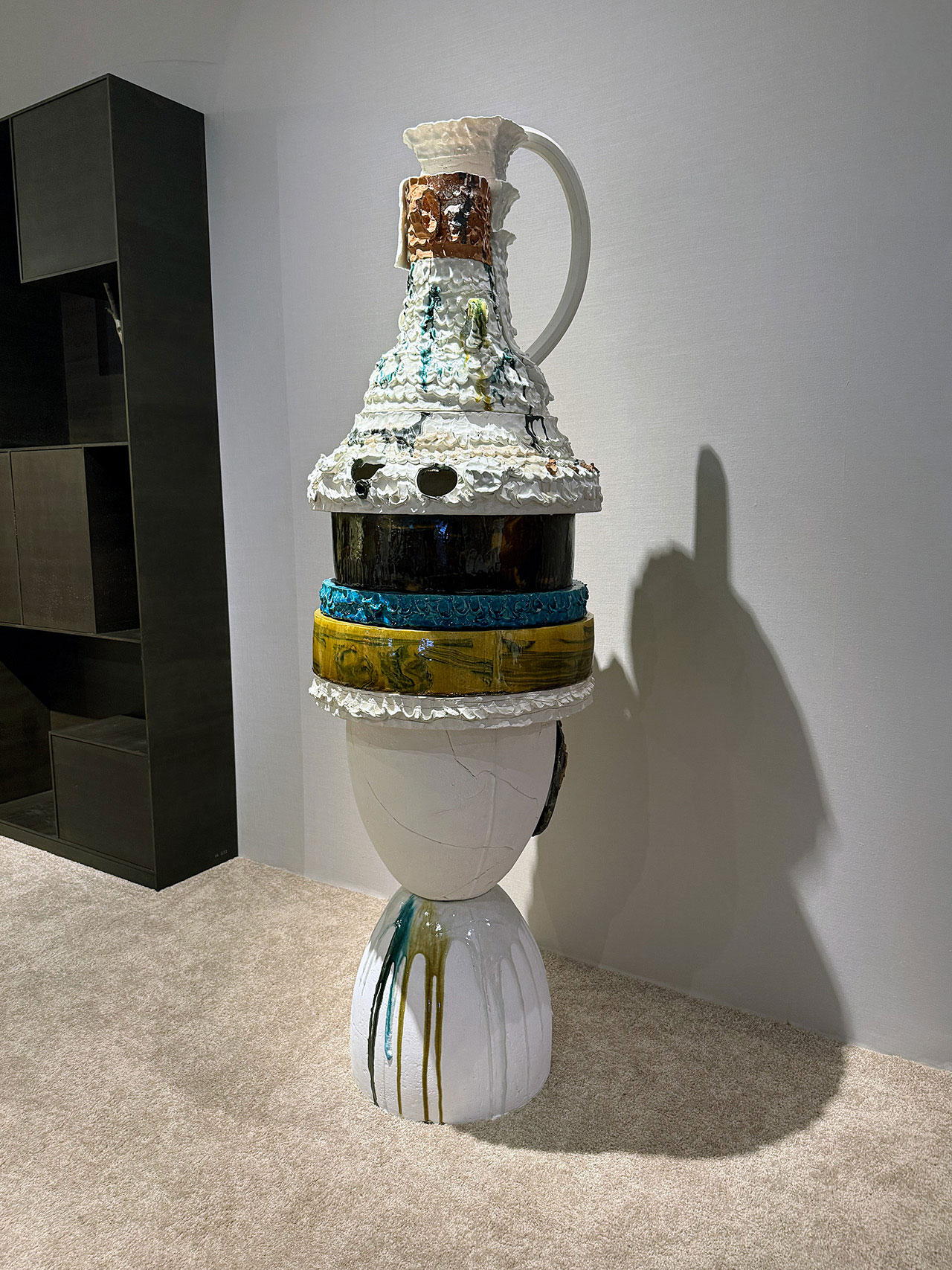 Maverick ceramicist Nicole Cherubini implements the medium to construct dysfunctional objects, in this case an oversized vase taking on human-scale proportions and the formation of a totem. Created using the unexpected pairing of white earthenware, terracotta, grog, epoxy, acrylic paint, and spray paint, Diagram of Love is a layered repository of references, recording various moments of use and prescribed meaning. The unashamedly grotesque and irreverent piece was presented by Friedman Benda.