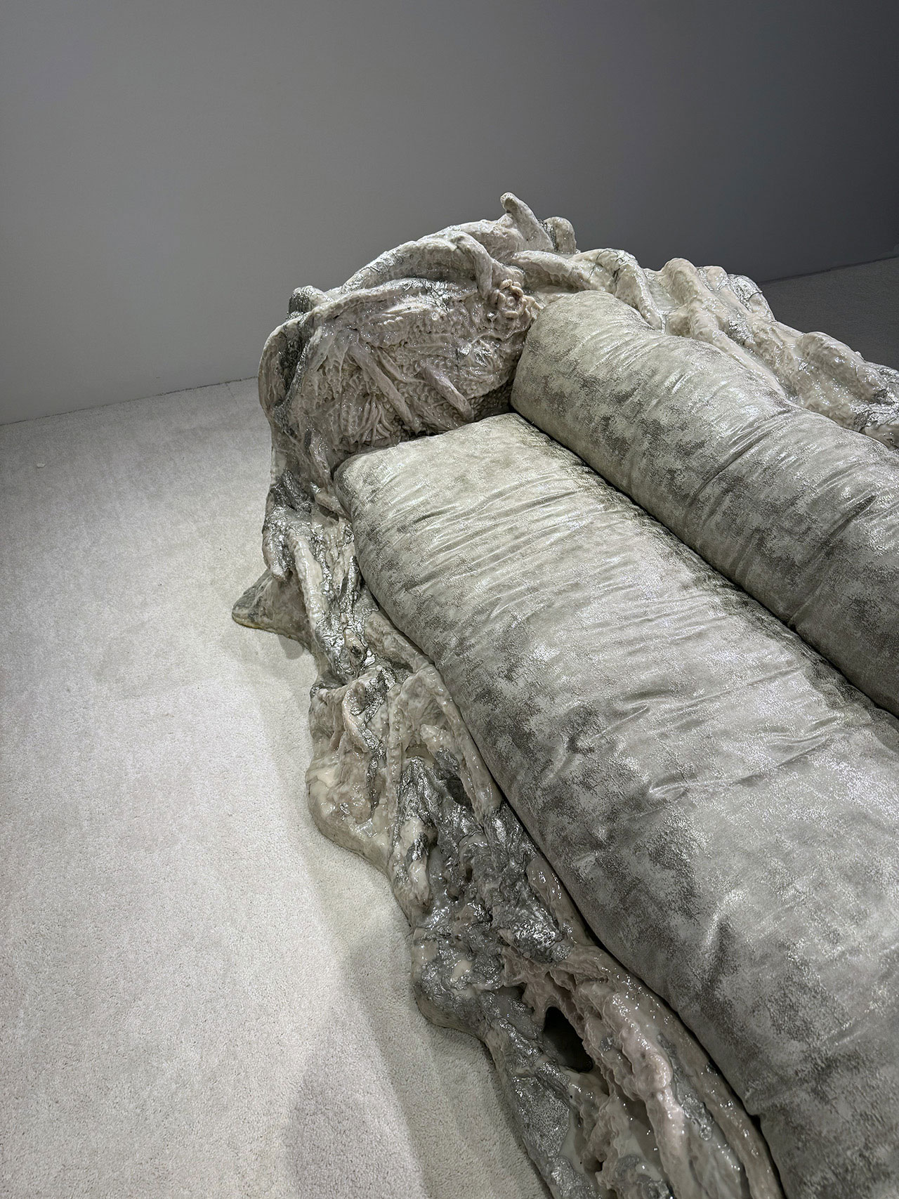 Respite could also be found in multidisciplinary creative Roham Shamekh’s adjacent booth. Here, fairgoers could sit and listen to a layered soundscape “designed as an inner journey, one that guides the soul back to its roots.” Such tendrilous formations, snaking through underground before emerging just above the surface, seem to also be the core of his entirely amorphous sofa and accompanying side tables. For these distinctive, almost half flora and half fauna, pieces, Shamek meticulously carved through a combined substance of ceramic and epoxy resin.