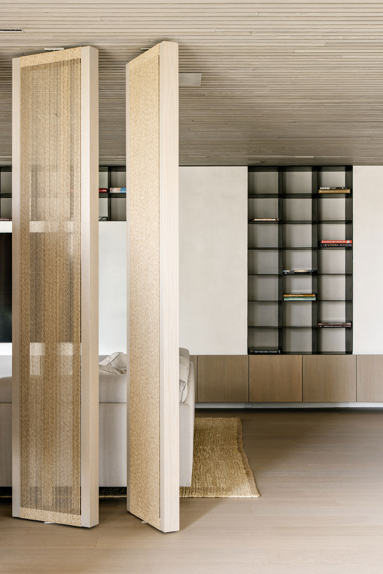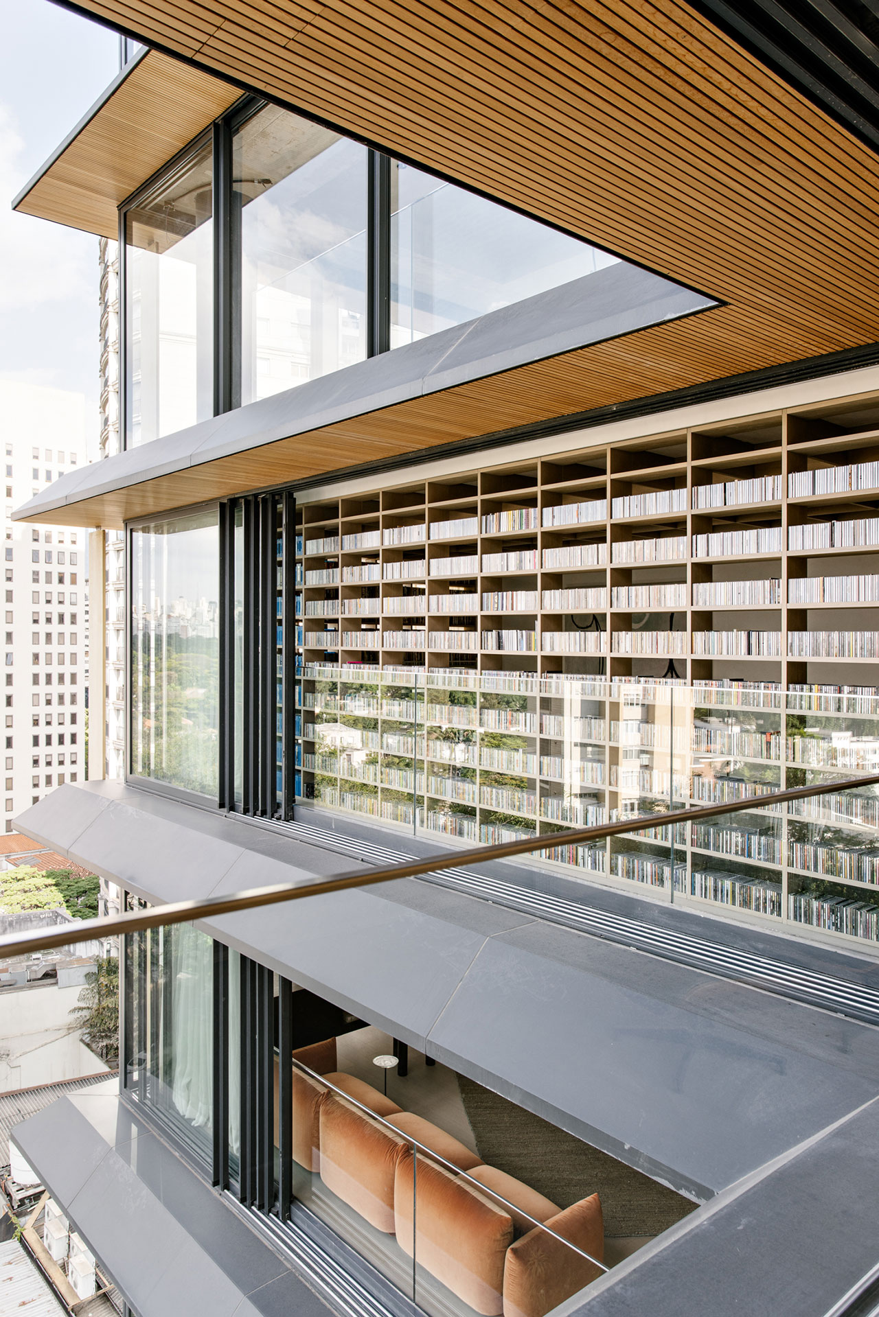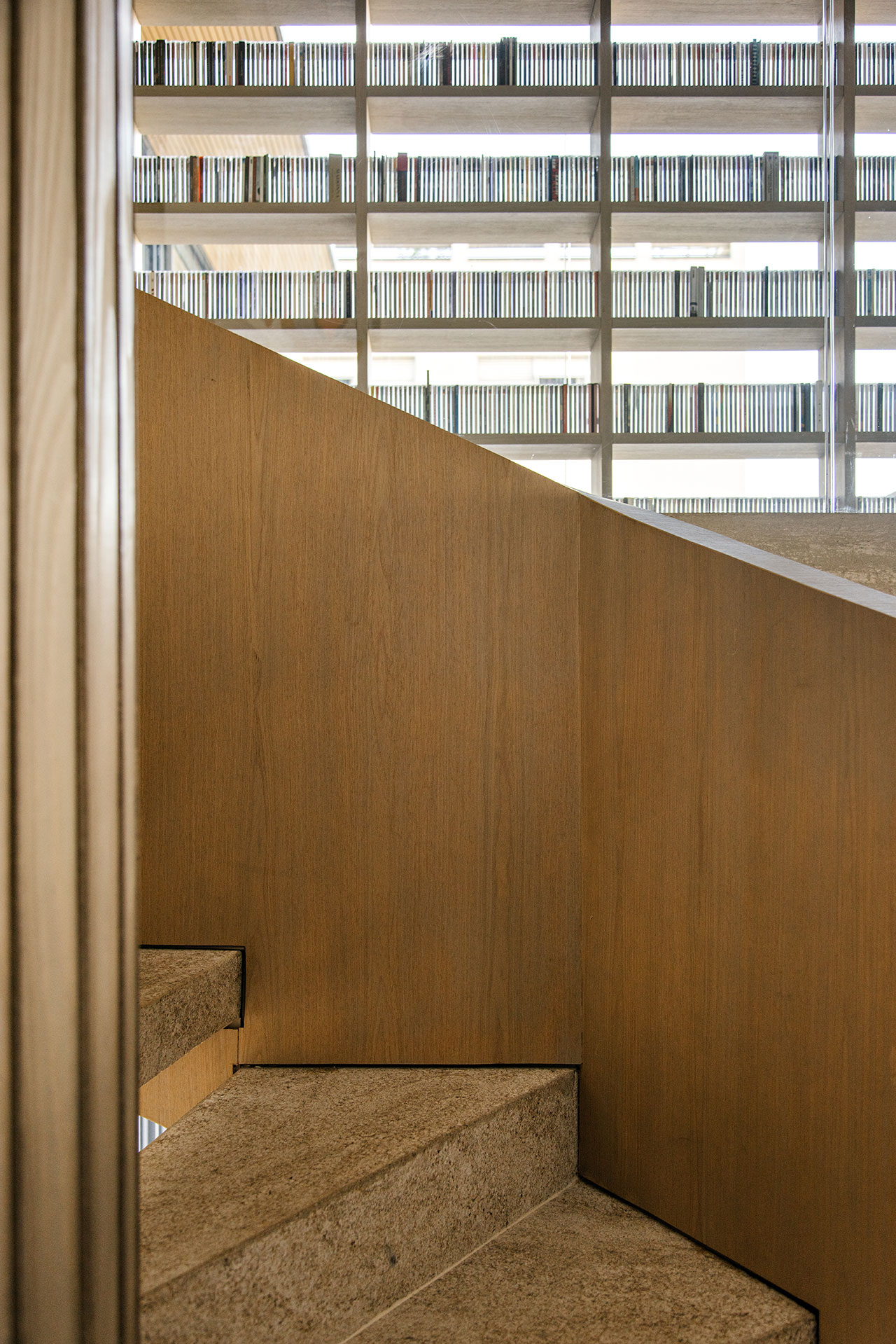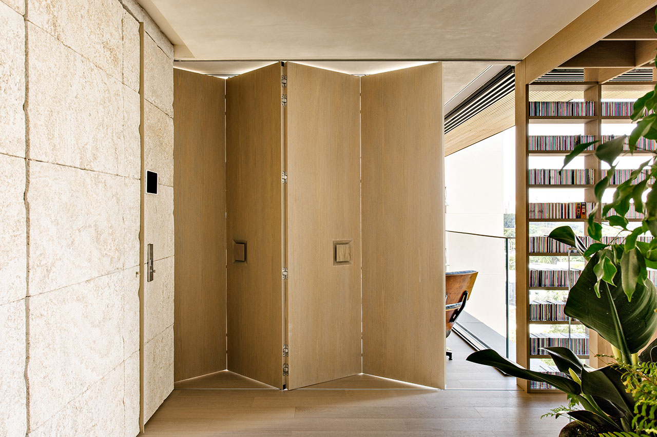 Rather than treating the CD collection as clutter or simply hiding it away in a closed-off room, the design turns it into architecture. Shelves line the apartment’s structural perimeter, elevated on walkways that encourage flipping through the musical archives looking for a favorite album. The repeating wood-framed modules guide the eye upward into the double-height living room, where natural light pours in through windows.
