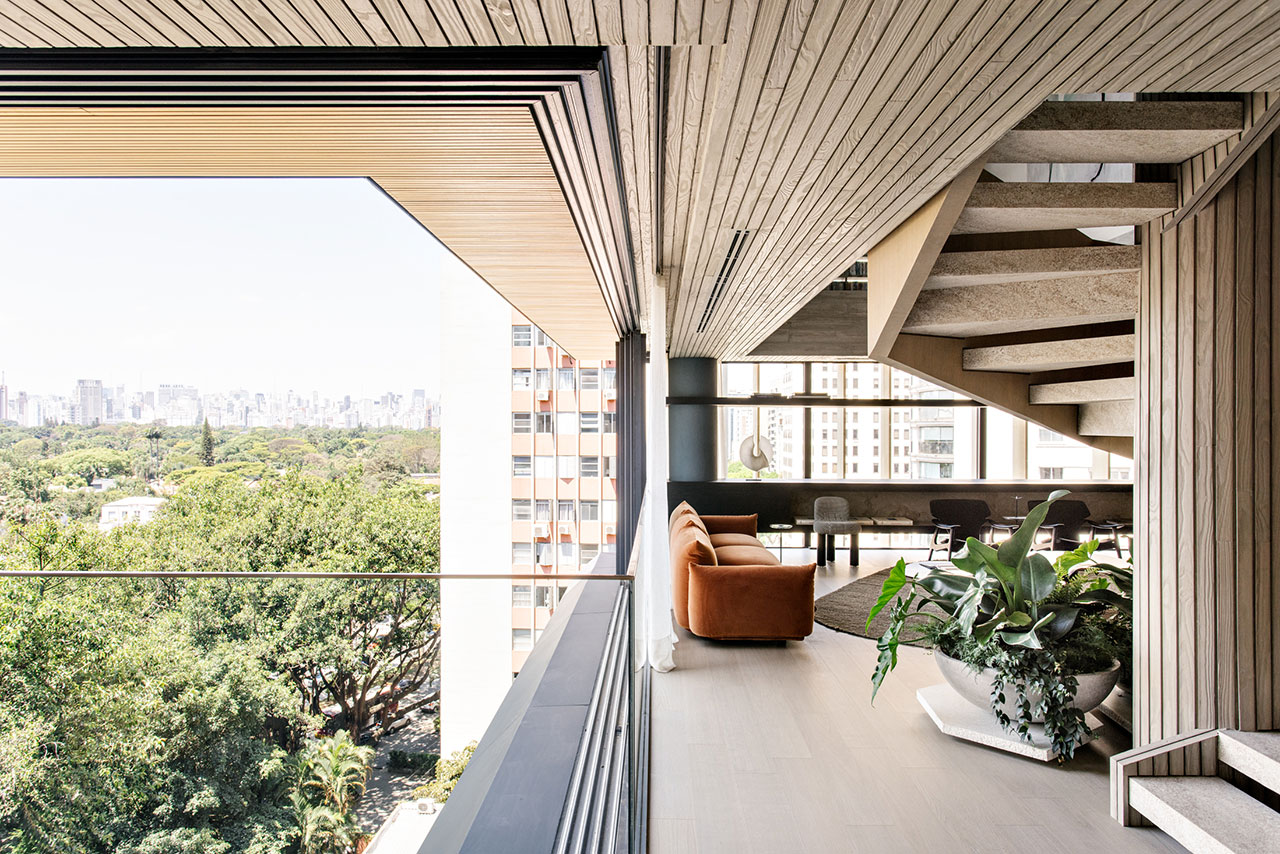 Some homes are designed to impress; others are designed to reflect the people who live inside them. Apartment NUBE, designed by Nati Minas & Studio + Flipê Arquitetura, manages to do both while floating – figuratively, of course – like a cloud above São Paulo, Brazil’s tree-lined Jardim Europa neighborhood. The urban retreat carefully balances calm with a sense of drama, thanks to the double-height living space, sliding glass walls that disappear, and the homeowner’s astonishing collection of more than 5,000 CDs.