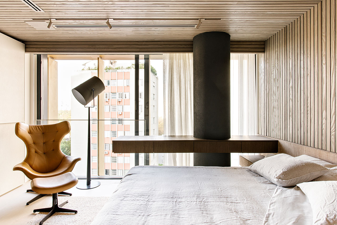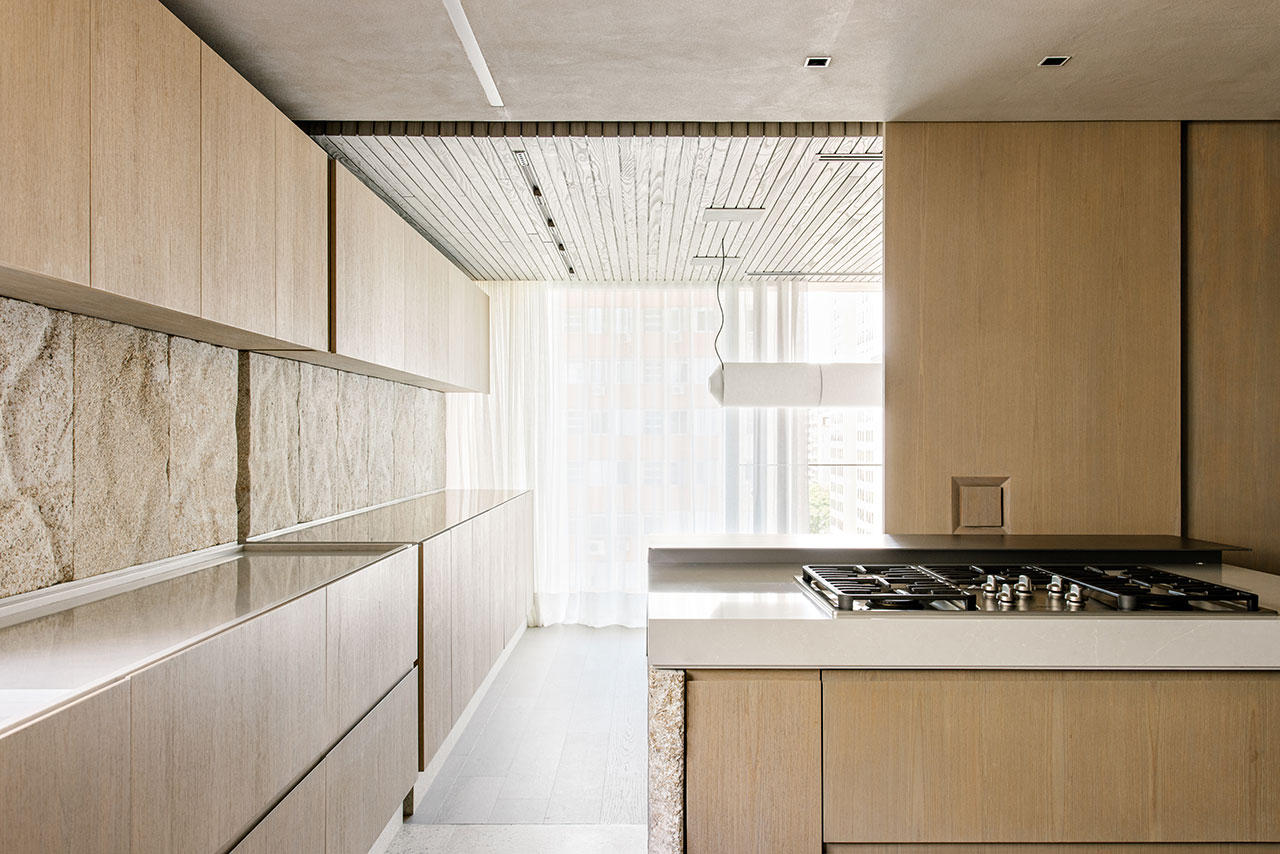 Apartment NUBE’s palette leans into texture in a tactile, grounding way. Chunky granite slabs appear throughout: an entrance wall with a hidden door, the sculptural staircase, the kitchen’s working surfaces, and the bar island. Their rugged surfaces contrast beautifully with the smoothness of the wood that spans the floors and ceilings, giving the social areas a sense of warmth.