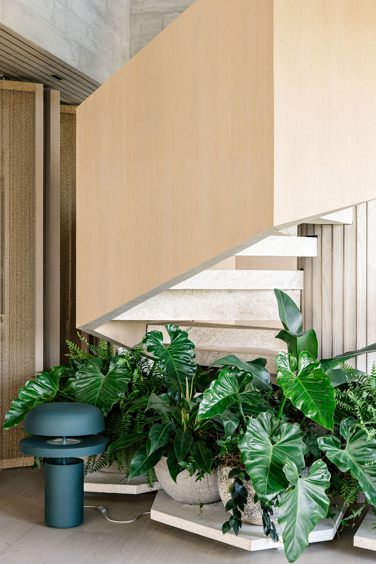 An angular staircase wrapped in a light, textured wood with rustic granite treads, connects the two floors and anchors the space with its sculptural presence.
