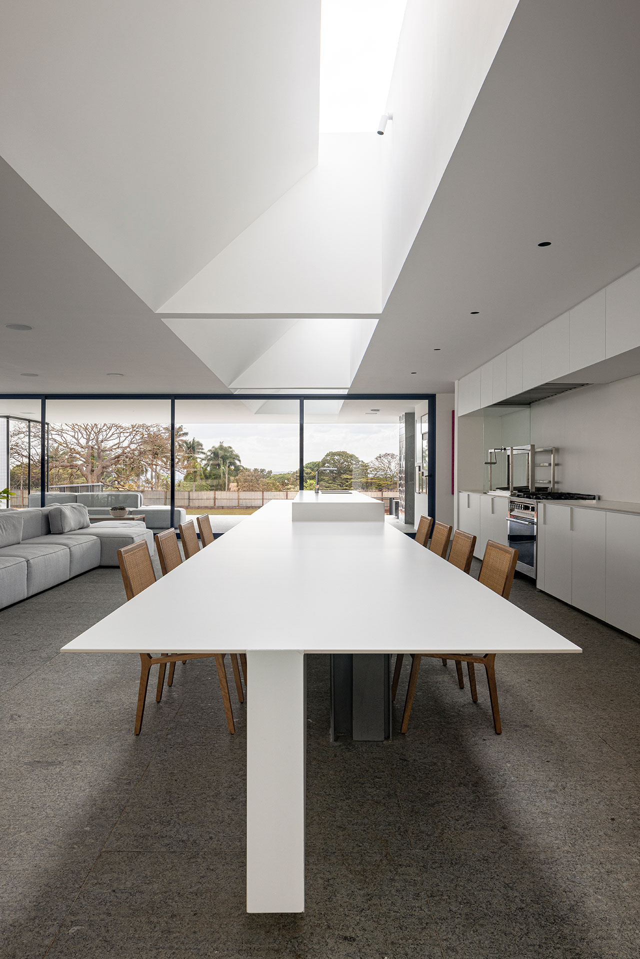 BLOCO Architects designed the 6,458-square-foot Galeria House in Brasília, Brazil, as a gallery concept that allows the residents to live immersed within a piece of art that also houses their collection of art. One of the most unique features of the house is its roof structure. Five massive inverted beams gracefully span a 12-meter-wide roof, creating the central area of the house known as “the gallery.” This space, which effortlessly blurs the boundaries between art and daily living, serves as a multifunctional area, accommodating a living room, dining room, kitchen, balcony, and a garage.