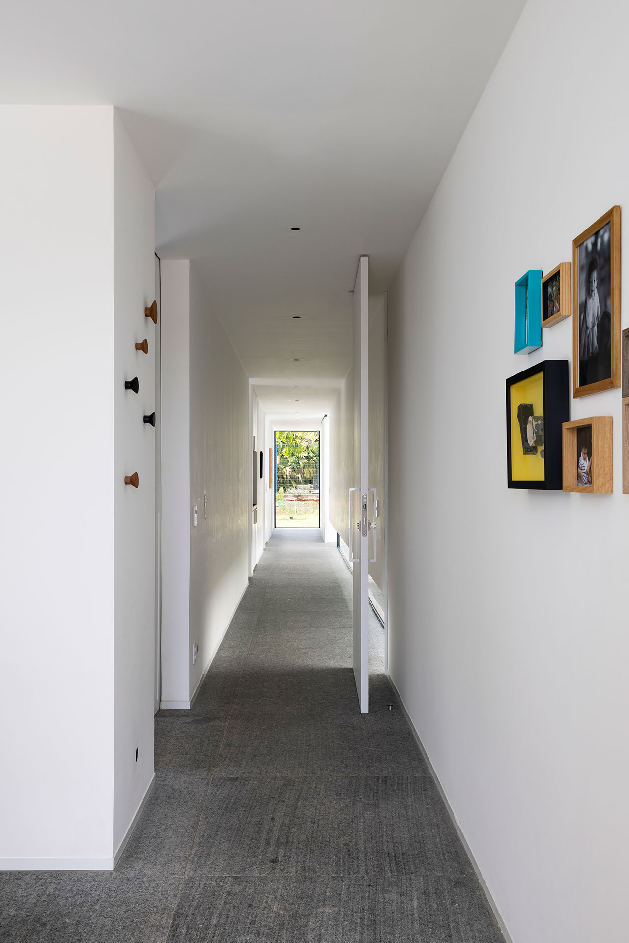 Galeria House’s design doesn’t stop at functionality and art preservation – it extends into the layout of the house. Two open linear gardens divide the living spaces, while adding biophilic elements. The first garden, closer to the street, sits between the solar protection wall and the central living area’s windows. The second one delineates the social area from the bedroom hall.