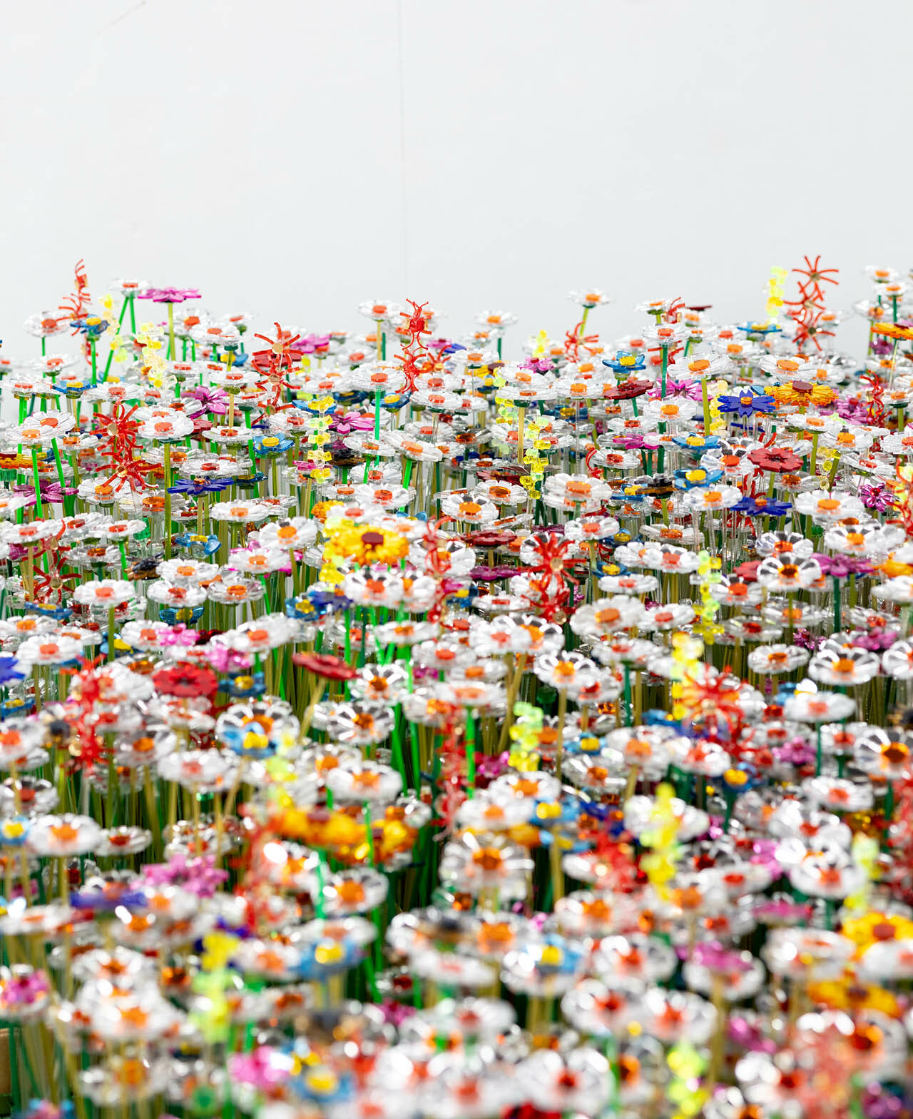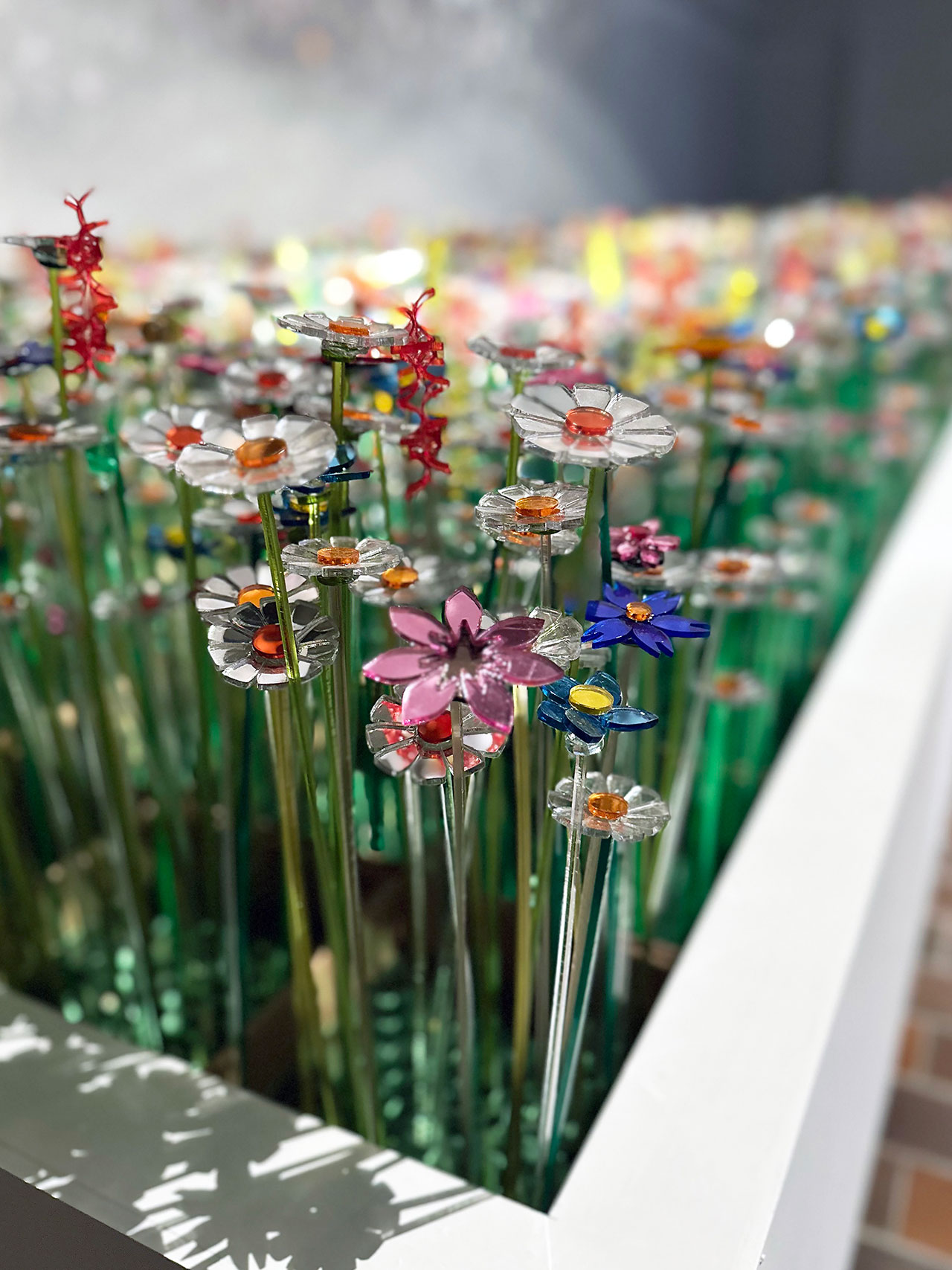 The flowers are made from discarded acrylic mirror offcuts, taking industrial remnants to a new, delightful level. The pieces are mapped and cut with meticulous precision, ensuring that every curve and edge makes full use of the original sheet. Once shaped, they’re assembled into one-of-a-kind sculptural blooms. Under focused lighting, the installation transforms: clusters of mirrored “petals” shimmer, scattering light in unpredictable constellations across walls and viewers alike.