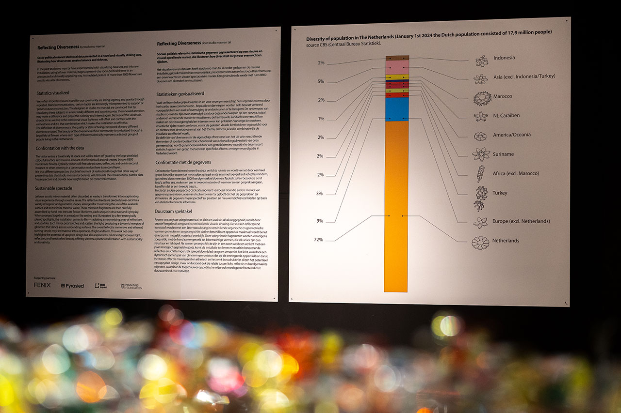 Meticulously gluing millions of petals to stems, and stems to leaves, each of the flowers represents a section of the Dutch public. All inherently different, yet derived of materials that came before, a poetic reinterpretation of a growing and changing society helps us to understand each other. Visual data is powerful, and especially when intertwined within artistic expression. A quotient that is almost intangible, the way we can understand much more readily, if we are given visual, intuitive markers of scale. Through this medium, studio mo man tai aimed to create a positive exploration of diversity, identity, and togetherness, strong tenets of a healthy society. In this way, we can reflect our ideas, quite literally, upon others – creating ripple effects we may never see, yet affect us all quite deeply.