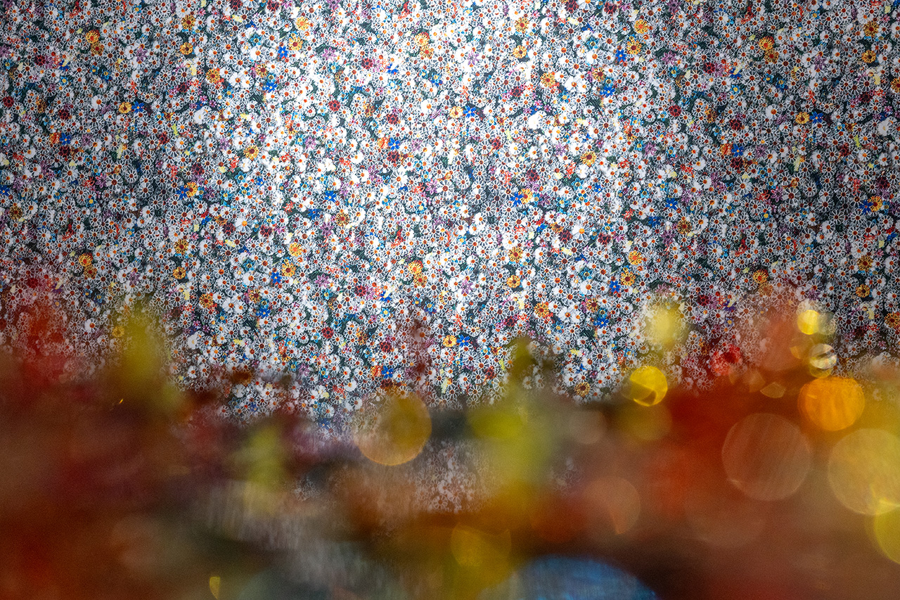 Extending the visual meadow even further, a bird’s eye view of the flowers are expertly printed on to fabric, creating an almost waterfall effect into the flowerbed below. Created by BIG Impact, who specializes in large-scale printing, the entirety of the exhibition can be printed onto any material at any scale, creating a velvet-like surface with rich depth and color saturation.
