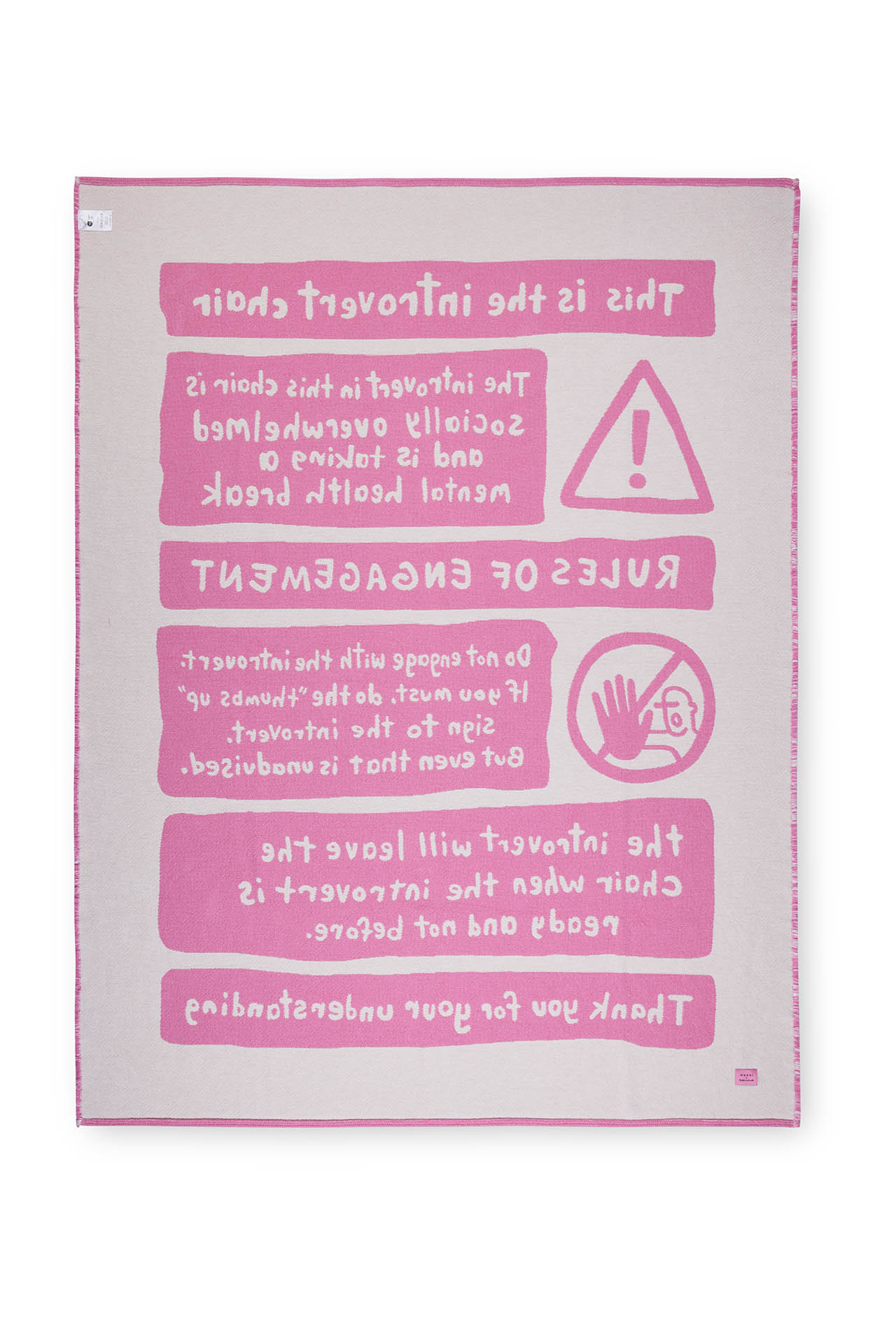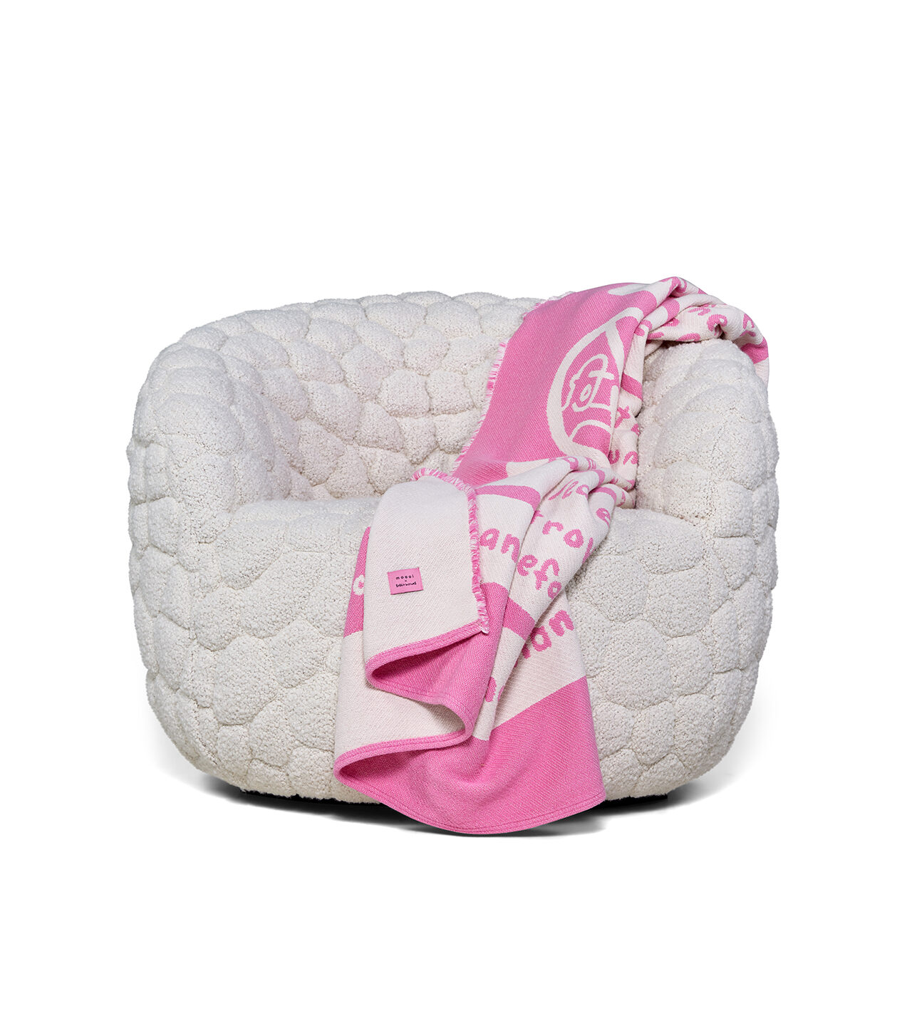 While both cheeky and a warning to those in the know, the double-sided blanket is rendered in ivory and pink, the opposite colors showcased on the back. Optional matching Comfort Cushions allow for further nesting – a full emotional support system disguised as design.