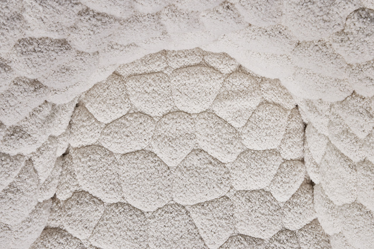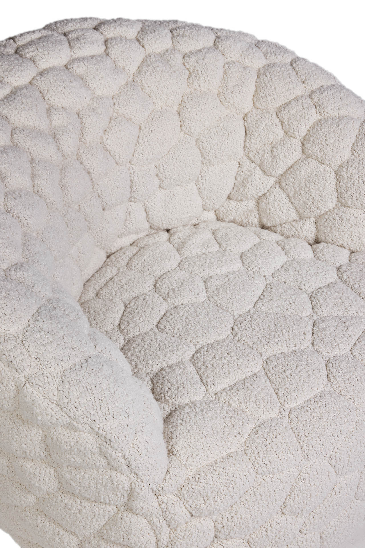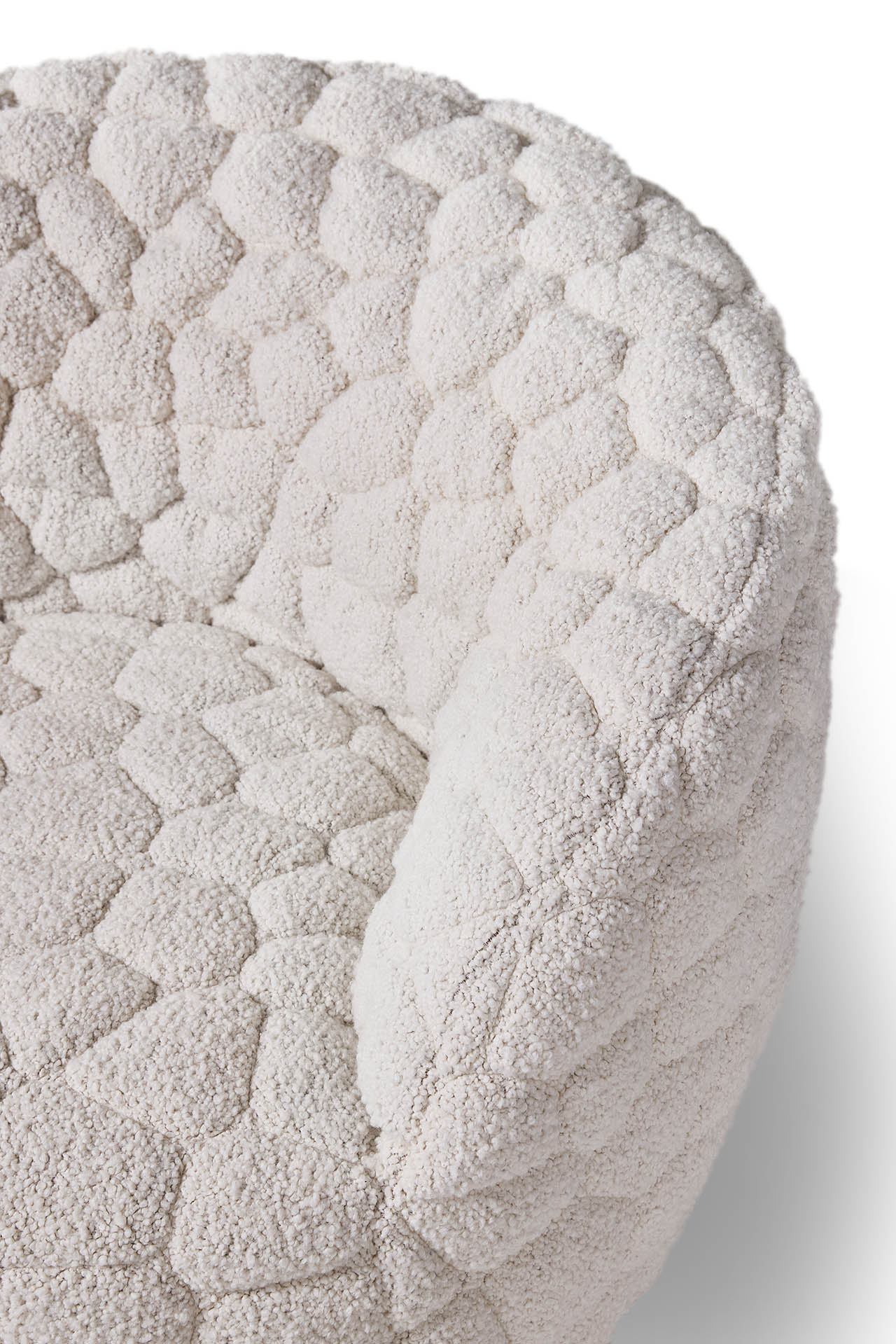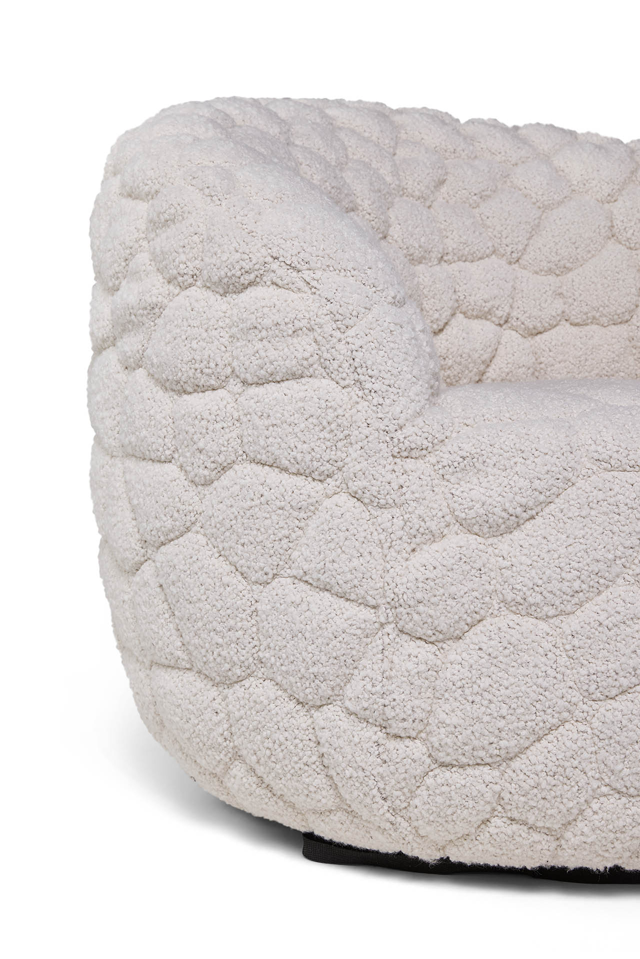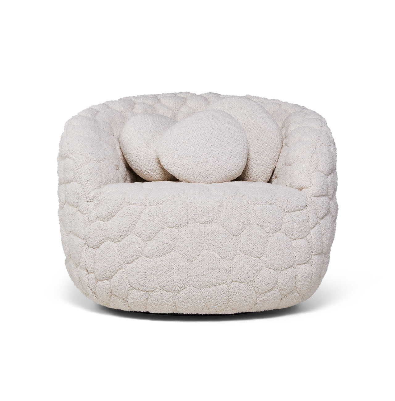 Designed as a “gentle rebellion against overstimulation,” the Introvert Chair is part sculpture, part sanctuary. Its generously padded wooden frame and enveloping curves create a cocoon-like shape that hugs the body, helped along by an internal swivel mechanism that adds a subtle sense of ease and movement. The fabric – a blended composition of virgin wool, alpaca, and cotton – is crafted using an innovative 3D quilting technique that transforms the material into a sculptural surface. The raised texture gives nod to many facets of nature we interact with every day – like river rocks or clouds – introducing a comforting tactile response to ground us in the moment. Each cover is individually stitched, a testament to Moooi’s meticulous craftsmanship and detail.