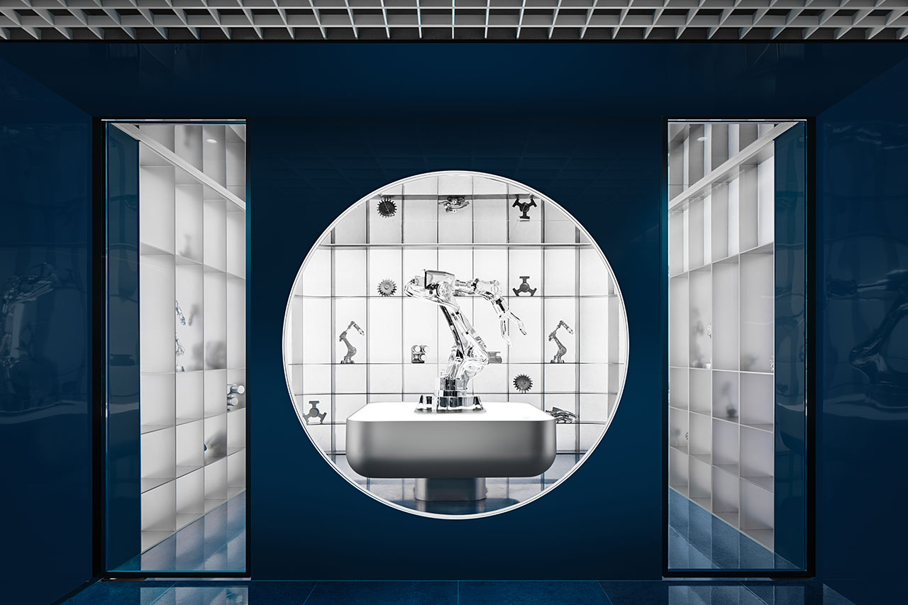 The five-floor show office captures a sense of motion. The curves of the reception desk and ceiling cutouts echo the fluid movement that happens on each level. Flagship products are highlighted on a circular display at the entrance, paired with interactive screens.