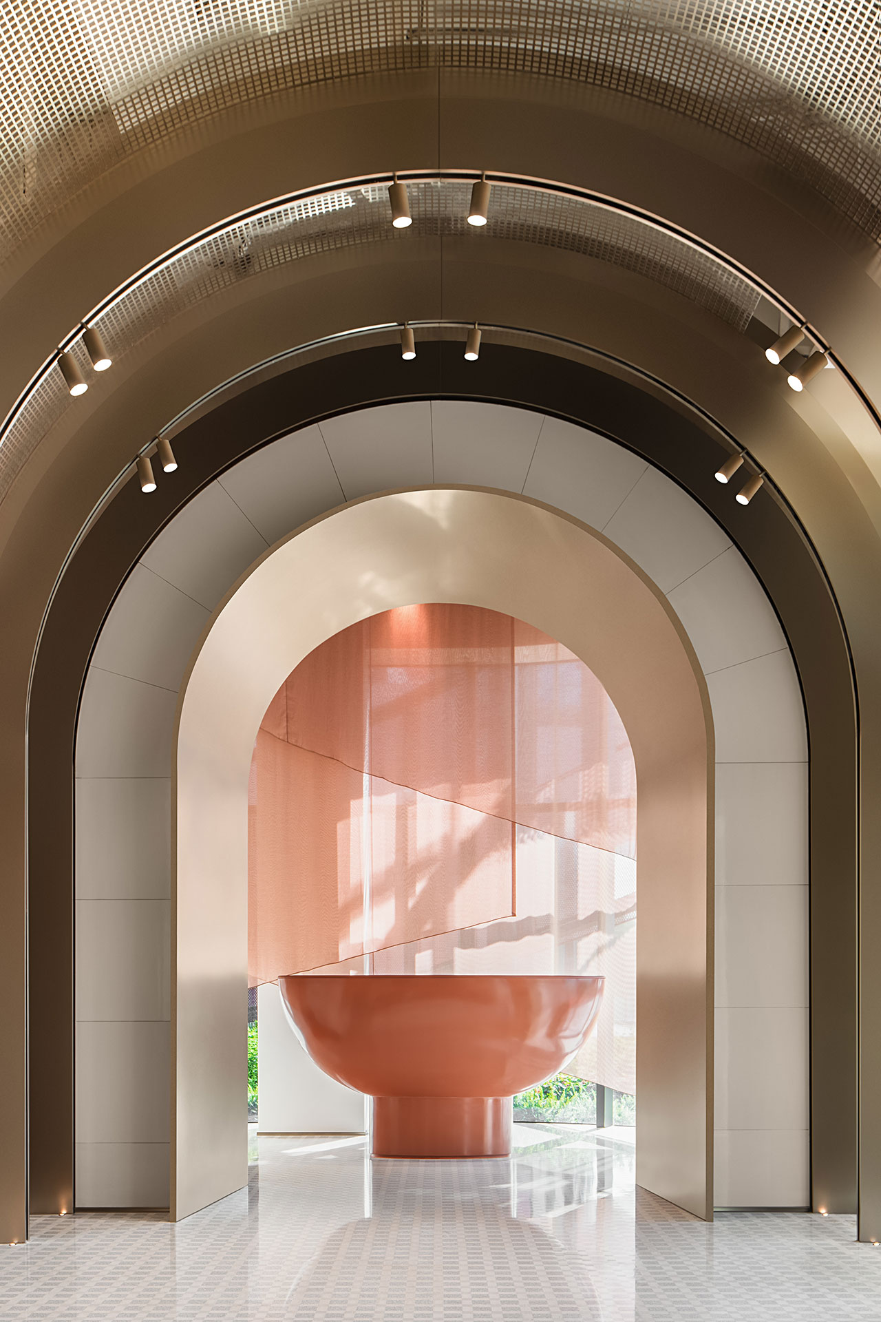 The journey begins for staff at the lobby of the sales center, where the region’s signature archways are reimagined. A delicate curtain of water encircles the reception area, reflecting the dancing dragon motif on the facade.