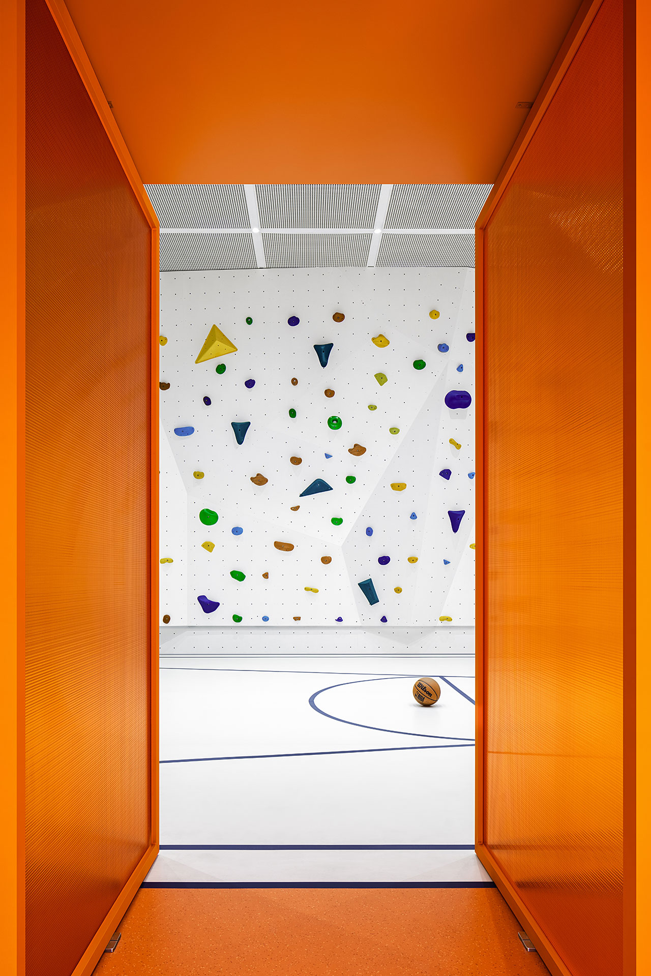 The souterrain houses basketball courts, climbing walls, and a gym so that employees can prioritize fitness or take part in a team sport. A mezzanine on this level doubles as a hospitality center, and boasts banquet spaces enclosed by faux fur curtains. The dining area offers an intimate setting for savoring meals.