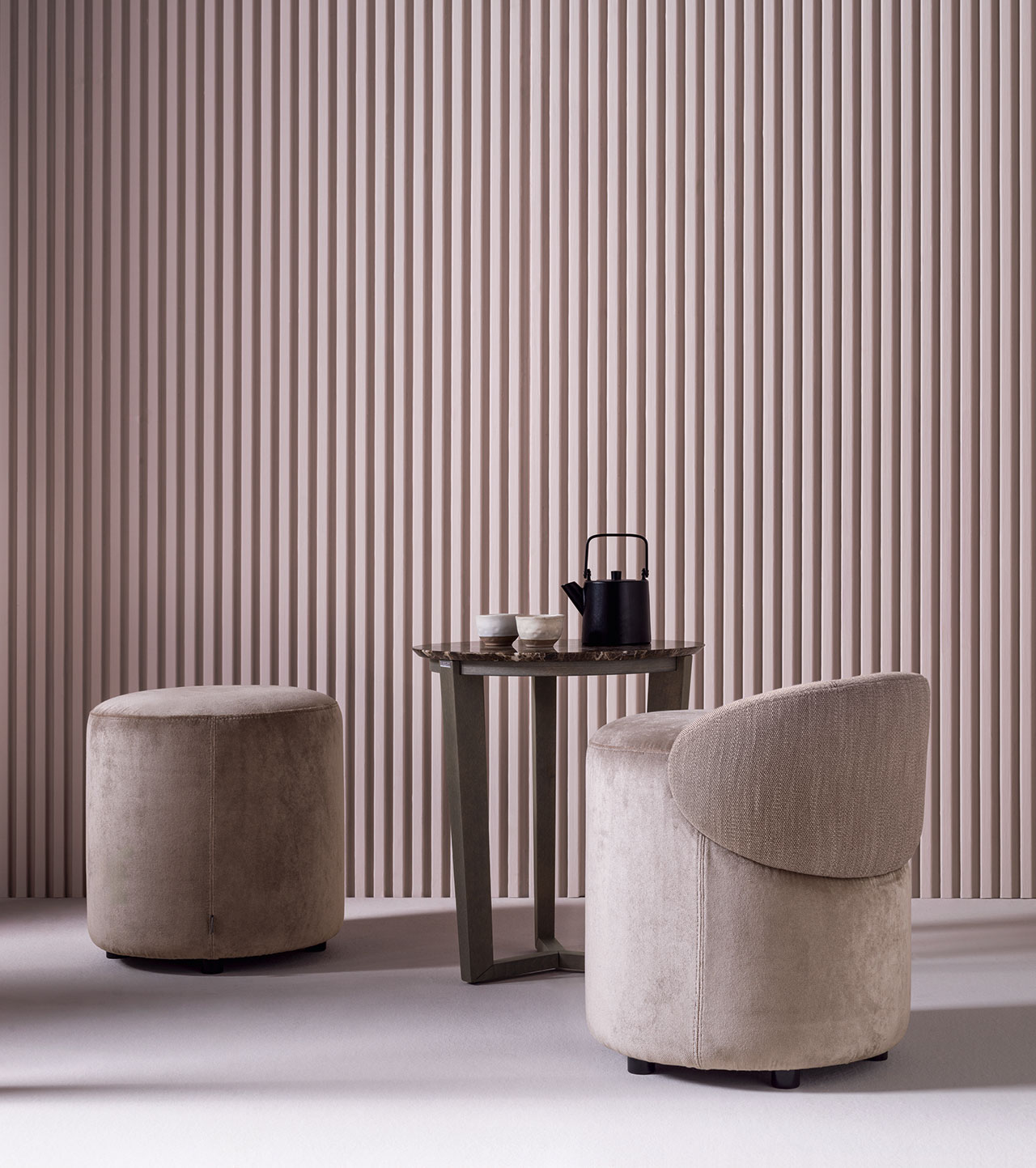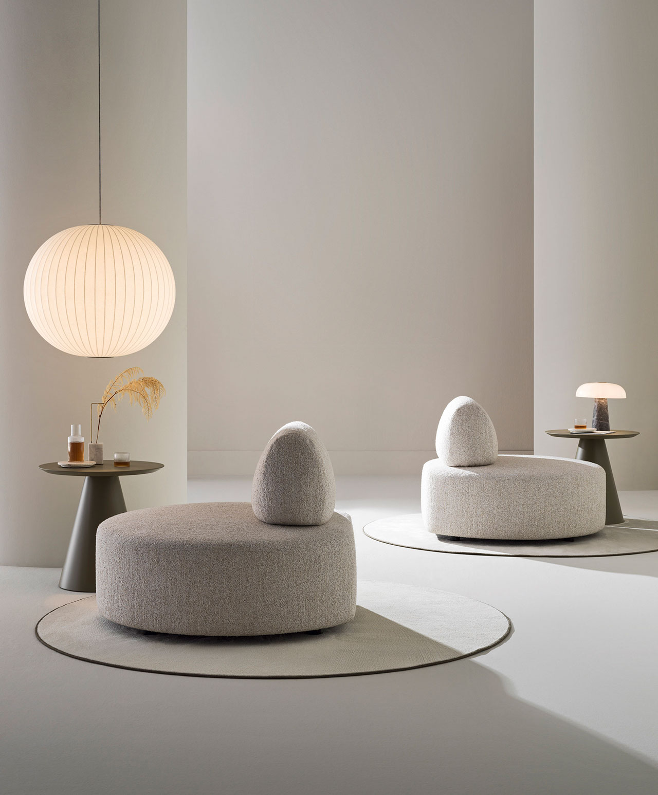 Daisy is designed to complement modular arrangements, which encourage people to sit across from each other and engage. This cylindrical chair features a short, quilted backrest, while the backless option doubles as an ottoman. Both versions are compact yet plush, suitable accents in all types of interiors.