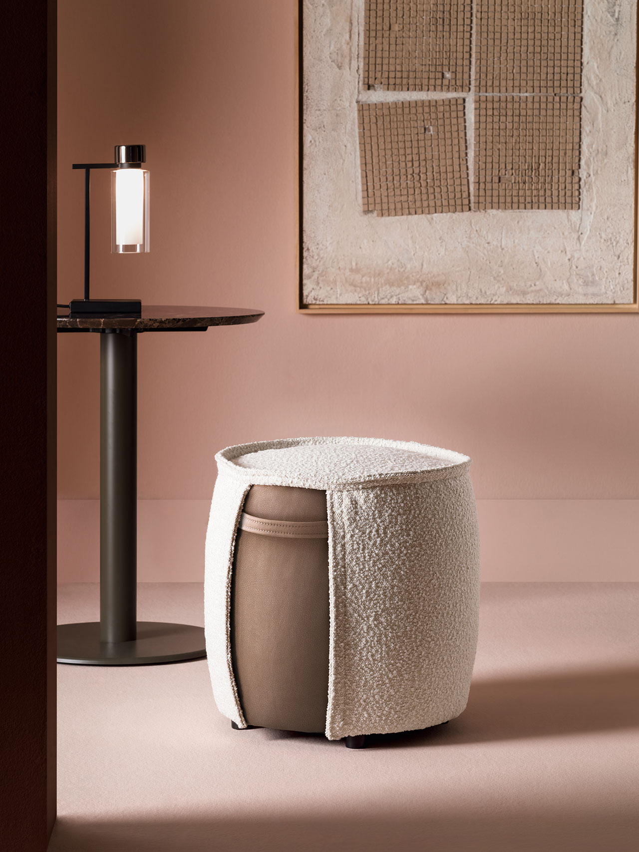 Nala is a chic, layered ottoman that can be dressed up or down, especially when upholstered with mixed materials. Specifiers can select an insert and handle in polo leather or another fabric. Raised edges are reminiscent of tailoring, and are the perfect finishing touch.