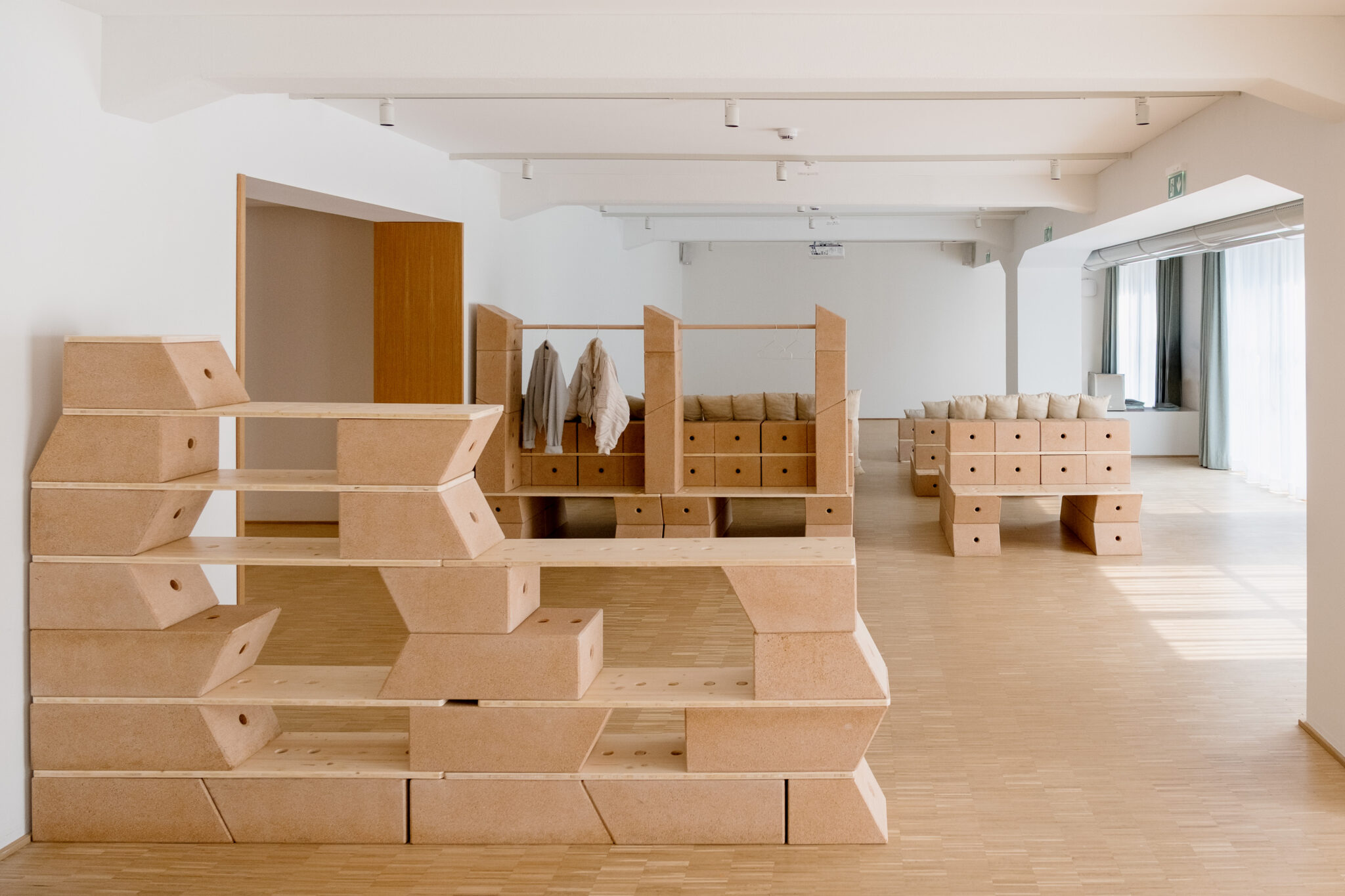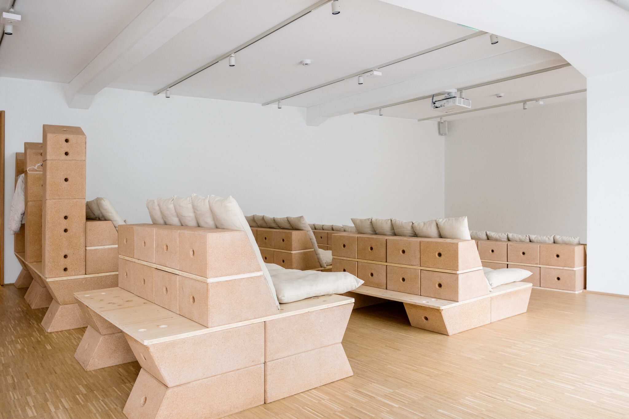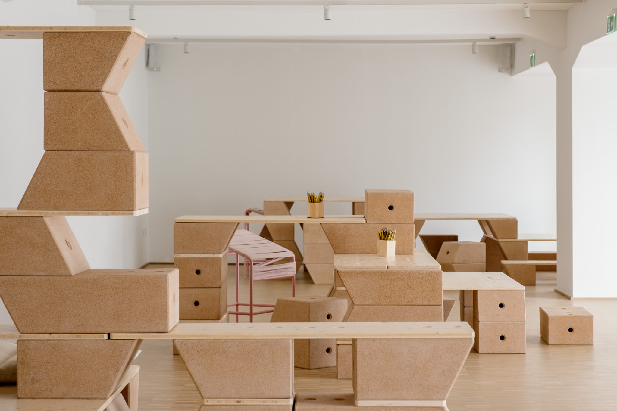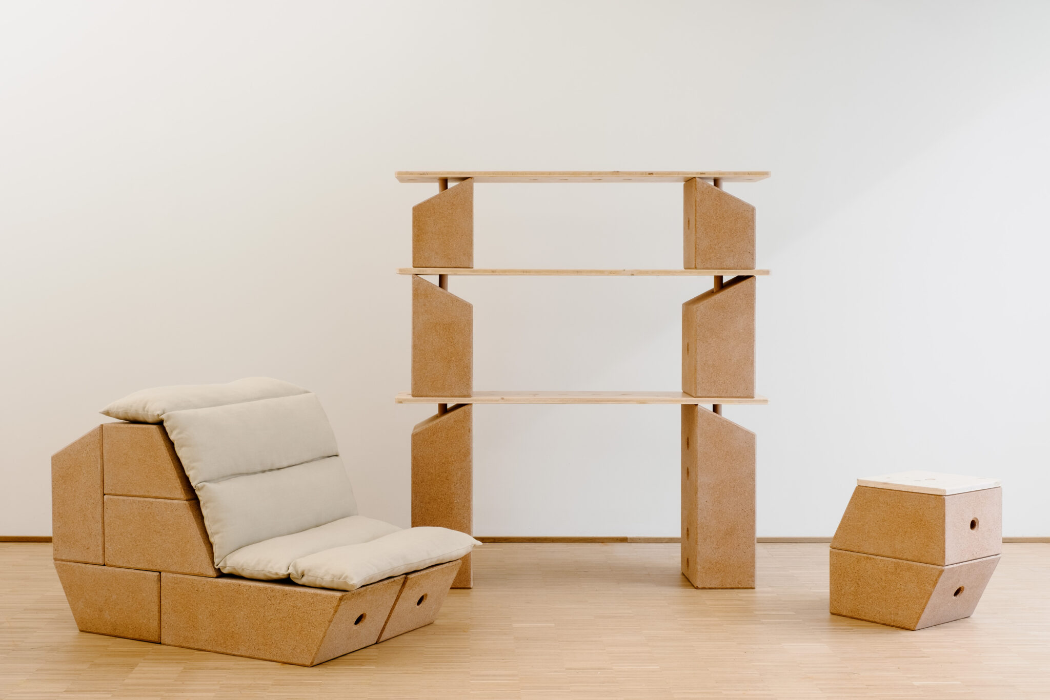 Gioco can be assembled into limitless configurations without a single nail or screw. Modular cork blocks and spruce tabletops, chosen for their durability and ecological qualities, allow users to build intuitively with minimal limitations. Wooden dowels allow pieces to connect in new ways, like forming a clothes rack, while padded cushions add comfort and softness to the system. This polytypological and reversible furniture system (RSP) is capable of transforming entire rooms – a workshop one moment, a dance studio, movie room, play area, or lounge the next. When stacked vertically, the cork blocks also double as a layer of sound and heat insulation. By building, stacking, and reshaping the system, visitors practice collaboration as much as creation, turning design into a dynamic shared experiment.