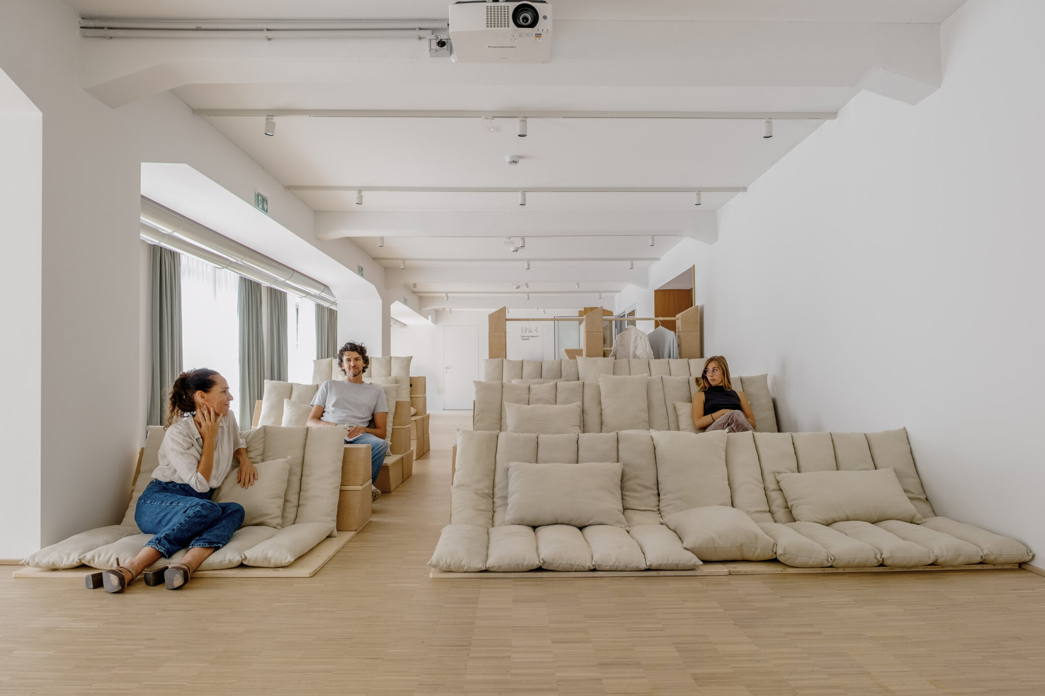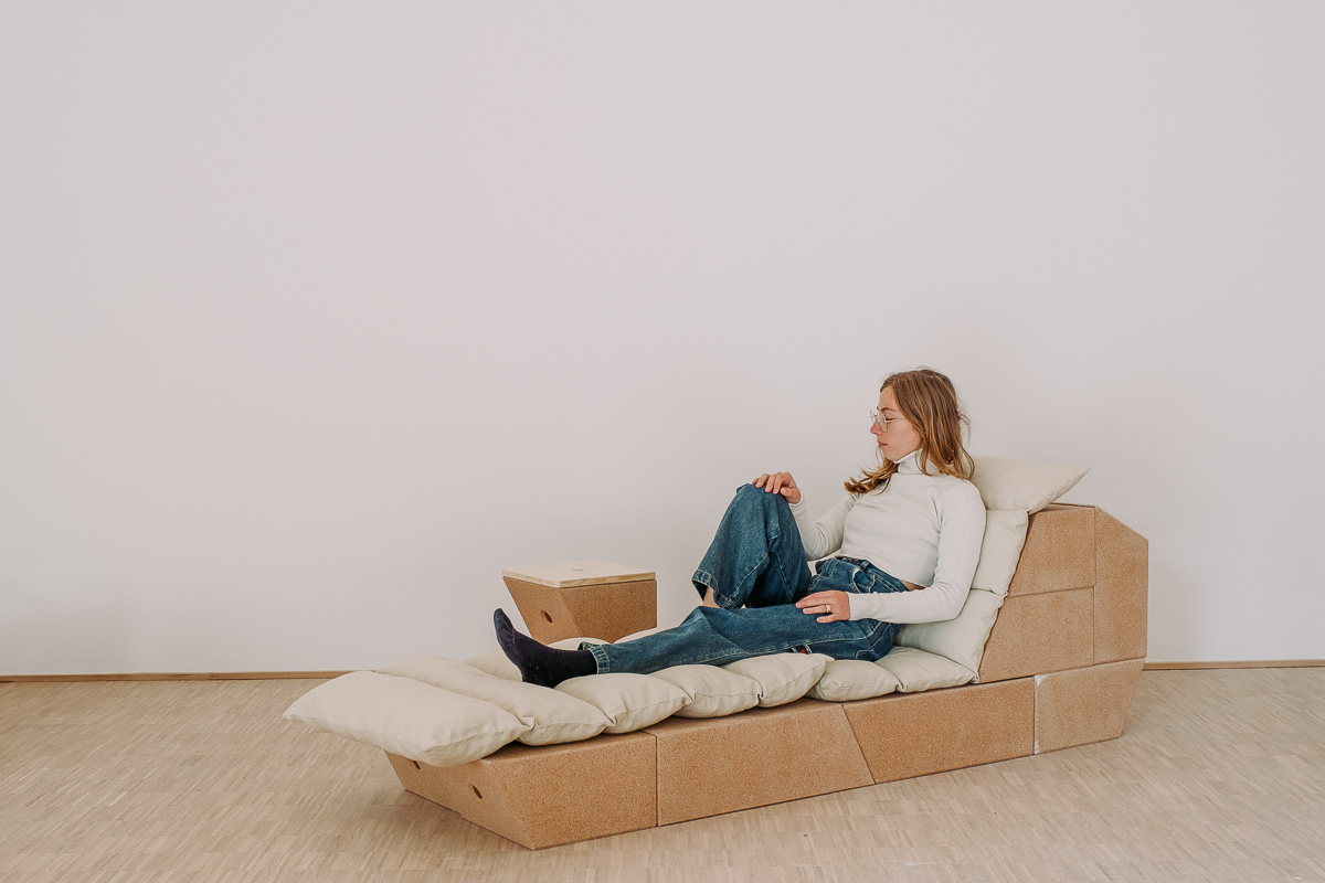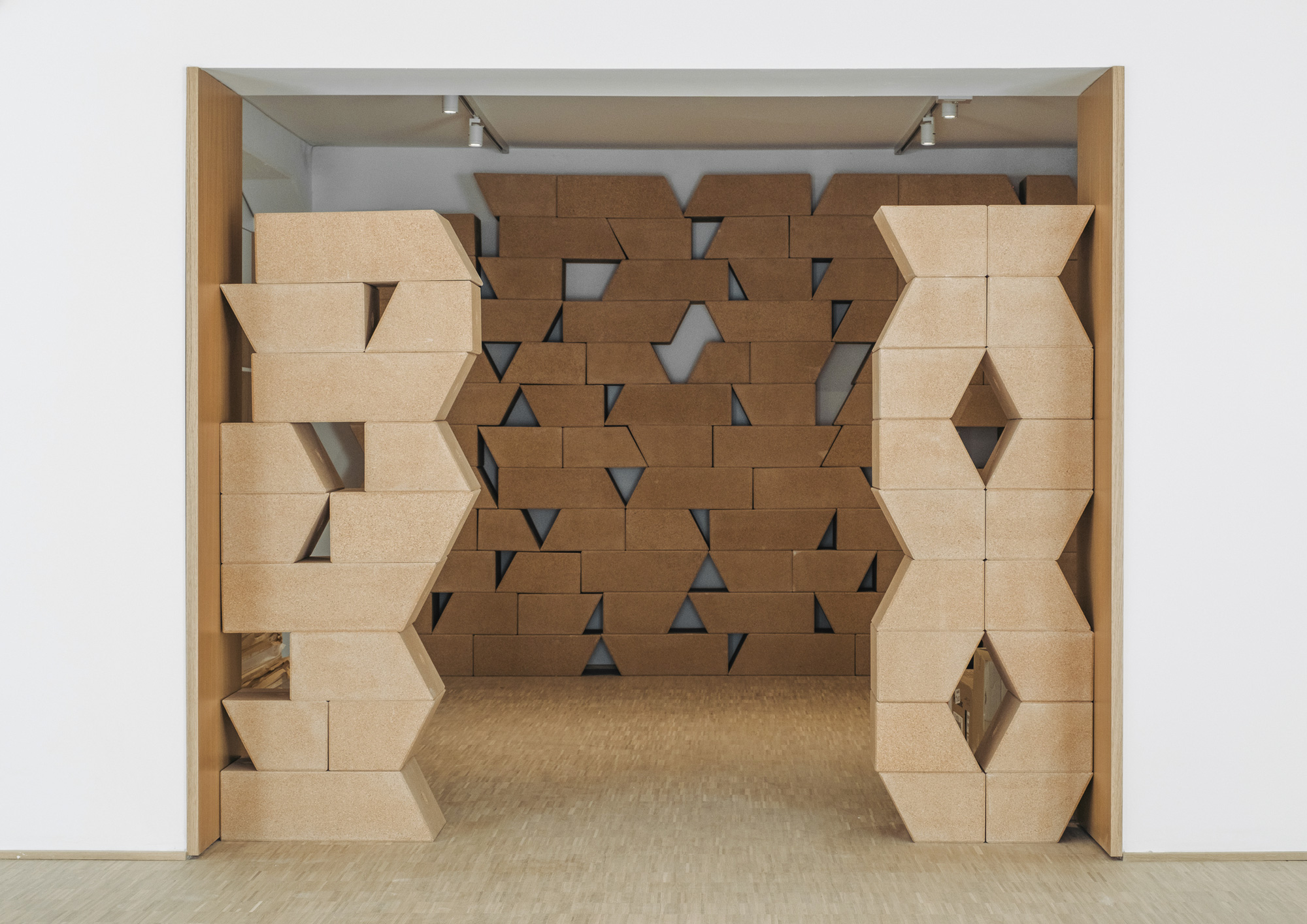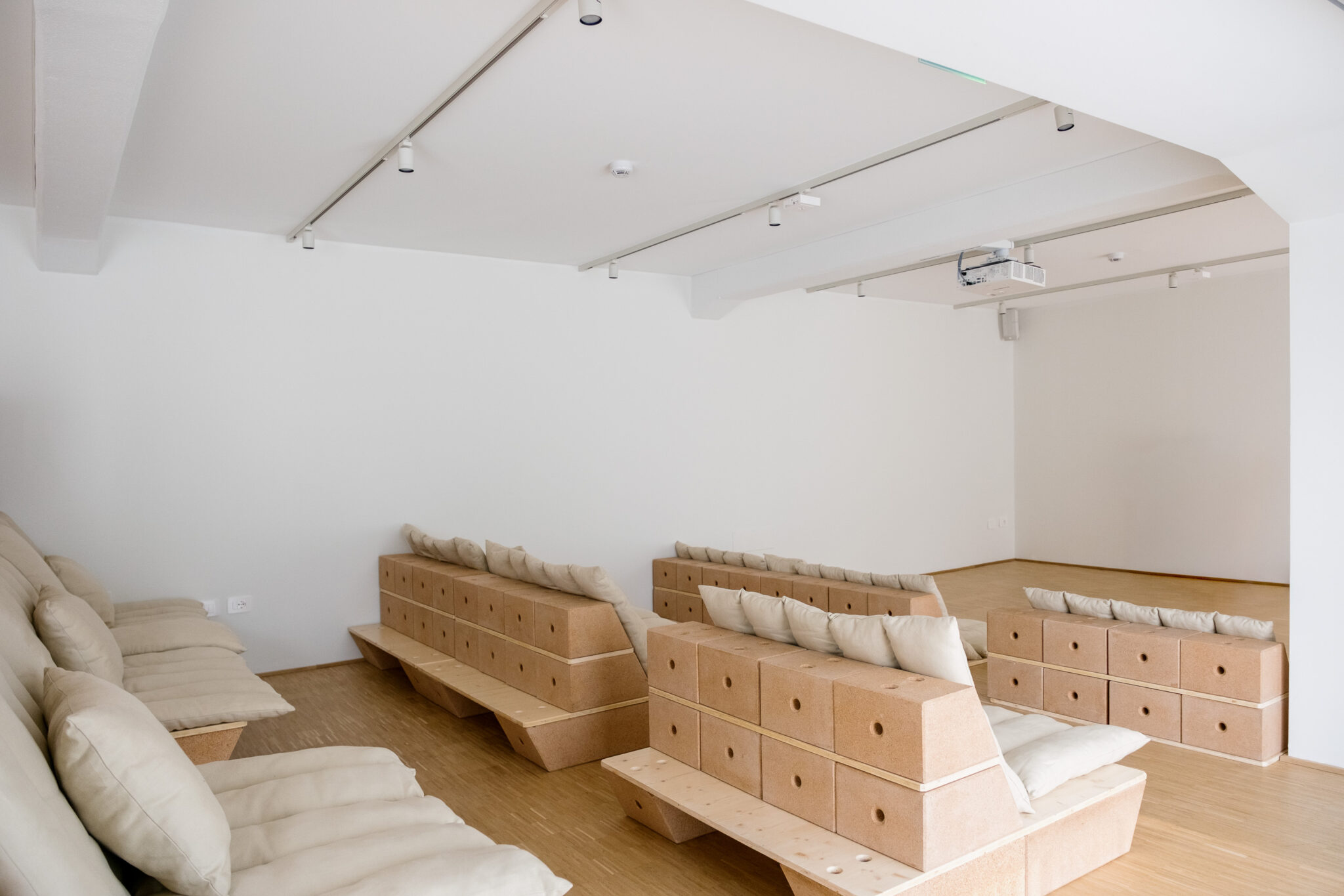 Gioco can be assembled into limitless configurations without a single nail or screw. Modular cork blocks and spruce tabletops, chosen for their durability and ecological qualities, allow users to build intuitively with minimal limitations. Wooden dowels allow pieces to connect in new ways, like forming a clothes rack, while padded cushions add comfort and softness to the system. This polytypological and reversible furniture system (RSP) is capable of transforming entire rooms – a workshop one moment, a dance studio, movie room, play area, or lounge the next. When stacked vertically, the cork blocks also double as a layer of sound and heat insulation. By building, stacking, and reshaping the system, visitors practice collaboration as much as creation, turning design into a dynamic shared experiment.