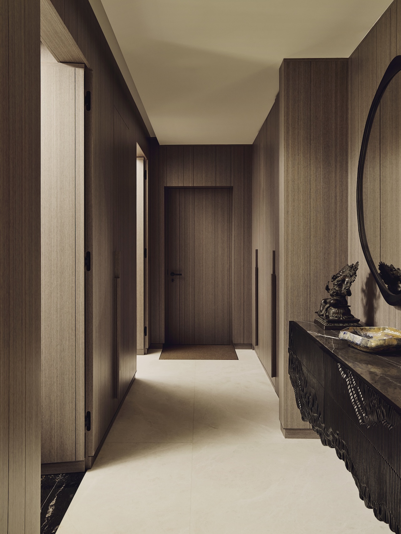 The collaboration with Indian craftsmen produced bespoke furniture that carries specific cultural resonance without veering into decorative exoticism. Oak finishes stained to warm depths, cast bronze details that catch light without glinting, and fabric selections in earthy tones all work to support rather than compete with artwork. The Charles Burnand pendant installation, spanning three stories through the central void, required extensive development of glass textures and colors – a process enabled by the homeowner’s own expertise in glass art, turning what could have been a client-designer transaction into genuine creative collaboration.