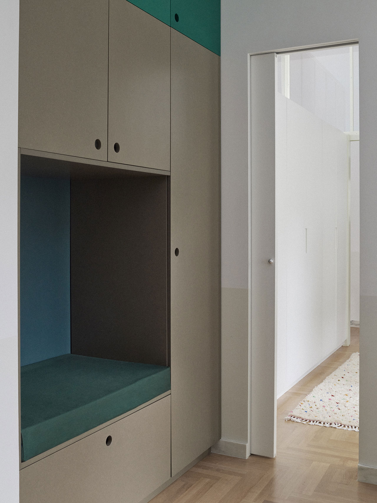 Inside, the once-fragmented layout now flows with purpose. The open-plan kitchen, dining, and living area forms the heart of the home where the family can gather. A highlight design moment occurs in the main bedroom, where an oversized original window was restored, and now filters natural light through an interior glass panel into the kitchen. The glass is framed within a custom-built wardrobe that stretches wall-to-wall. When the sun sets, it glows softly from within, transforming into an atmospheric light installation that shifts the apartment’s mood from bright and airy to warm and intimate.