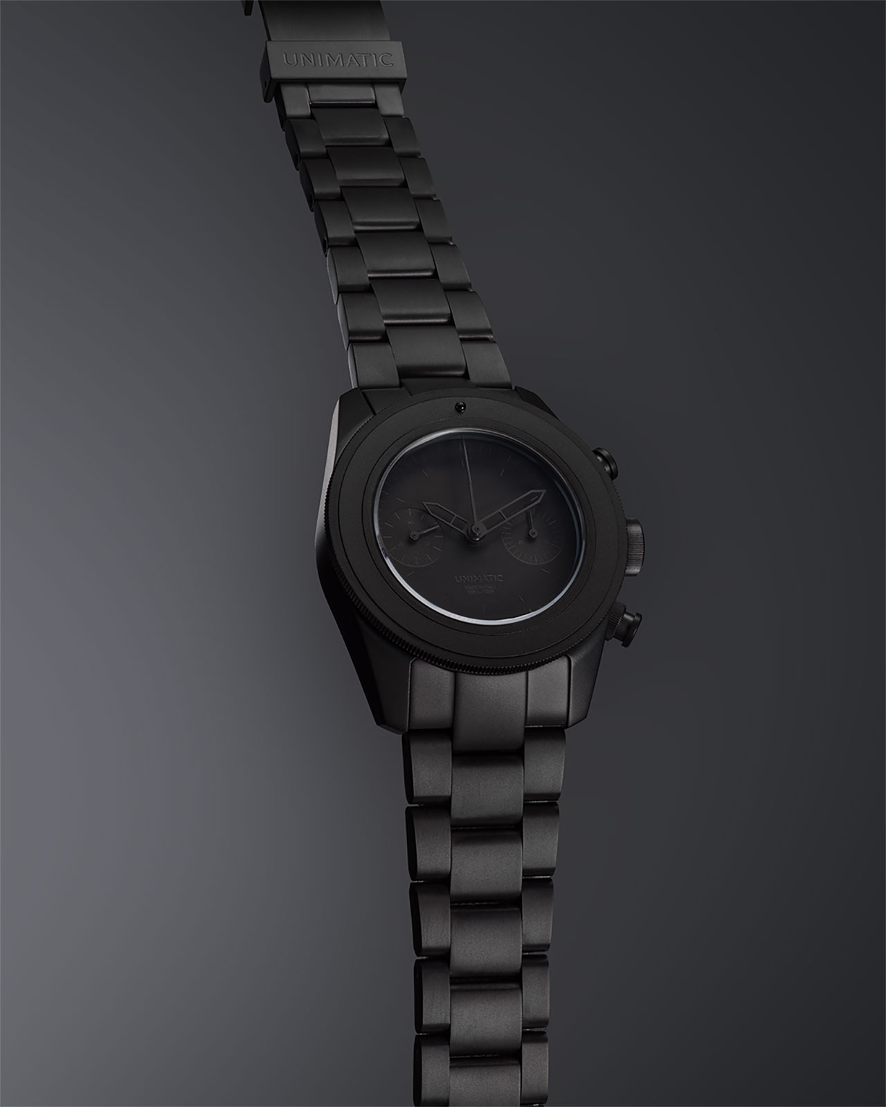 Can a watch be all black and still serve its primary function? Apparently, yes. With a matte black index dial, off-black concentric subdials, and a sandblasted black DLC stainless steel case and bracelet, the just released UNIMATIC x Maxfield Modello Tre U3S-M Chronograph Watch demonstrates the stylistic feasibility of layering tone on tone. It comes down to carefully calibrating nuanced contrasts. The new design isn’t just an aesthetic flex though.