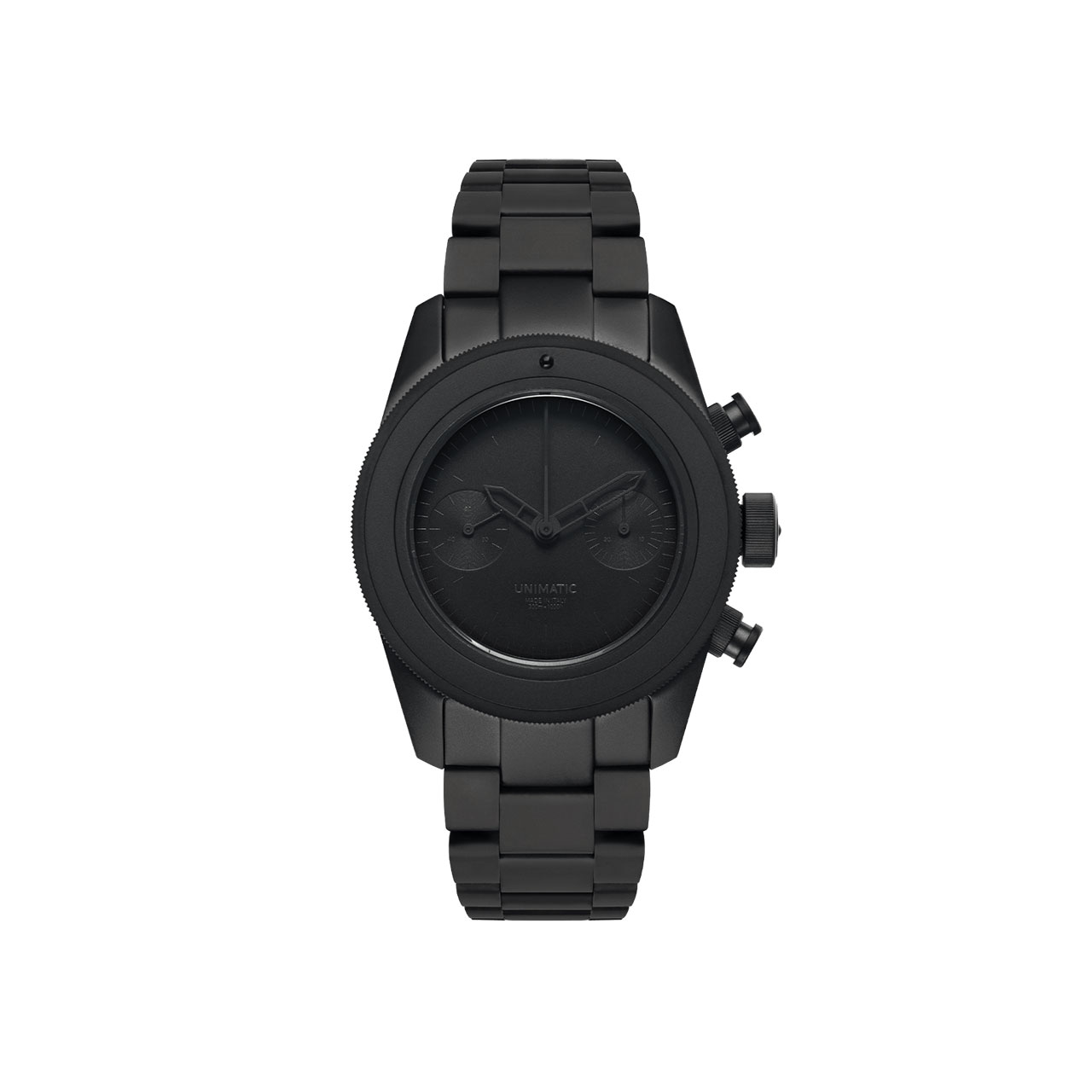 The UNIMATIC tonal black timepiece – developed with legendary Los Angeles concept store Maxfield – is hyper performative. Engineered with an automatic chronography, the watch has a water resistance of close to a 1000-feet.