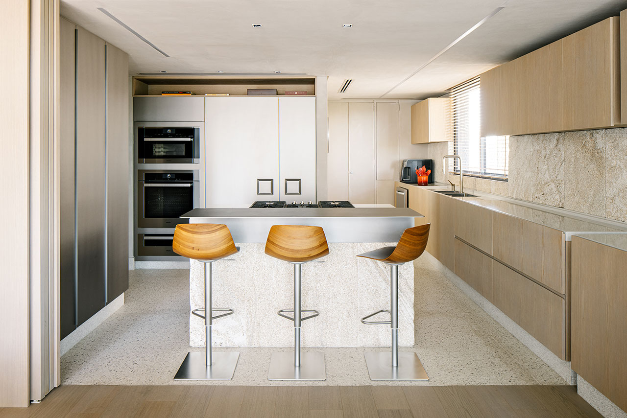 Apartment NUBE’s palette leans into texture in a tactile, grounding way. Chunky granite slabs appear throughout: an entrance wall with a hidden door, the sculptural staircase, the kitchen’s working surfaces, and the bar island. Their rugged surfaces contrast beautifully with the smoothness of the wood that spans the floors and ceilings, giving the social areas a sense of warmth.