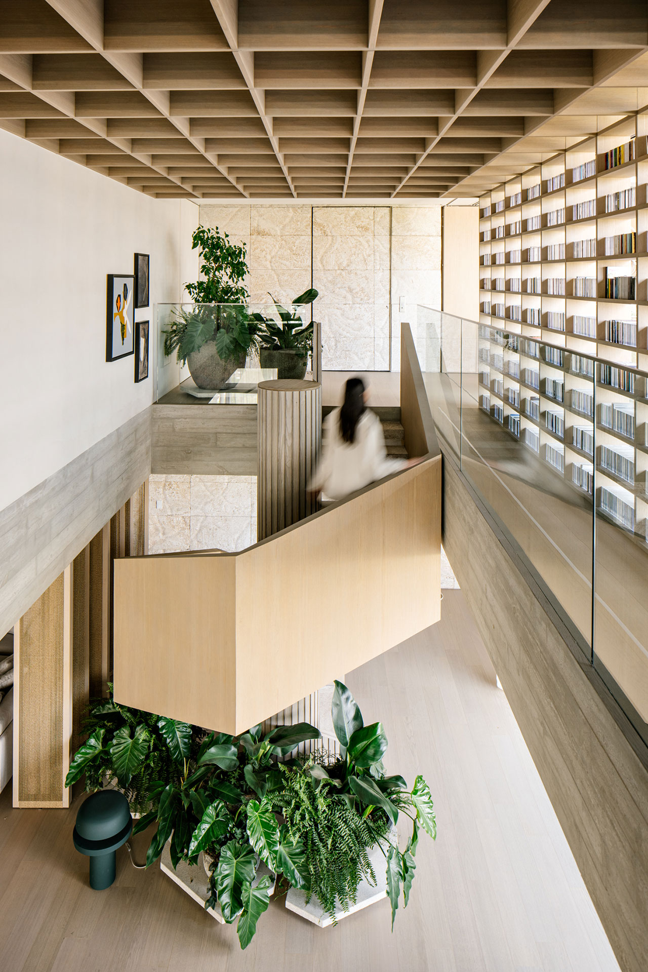 Rather than treating the CD collection as clutter or simply hiding it away in a closed-off room, the design turns it into architecture. Shelves line the apartment’s structural perimeter, elevated on walkways that encourage flipping through the musical archives looking for a favorite album. The repeating wood-framed modules guide the eye upward into the double-height living room, where natural light pours in through windows.