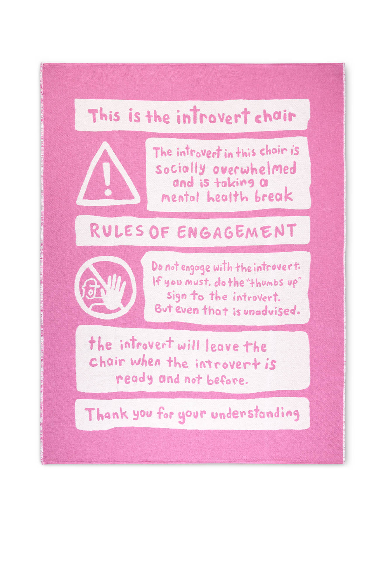 While both cheeky and a warning to those in the know, the double-sided blanket is rendered in ivory and pink, the opposite colors showcased on the back. Optional matching Comfort Cushions allow for further nesting – a full emotional support system disguised as design.